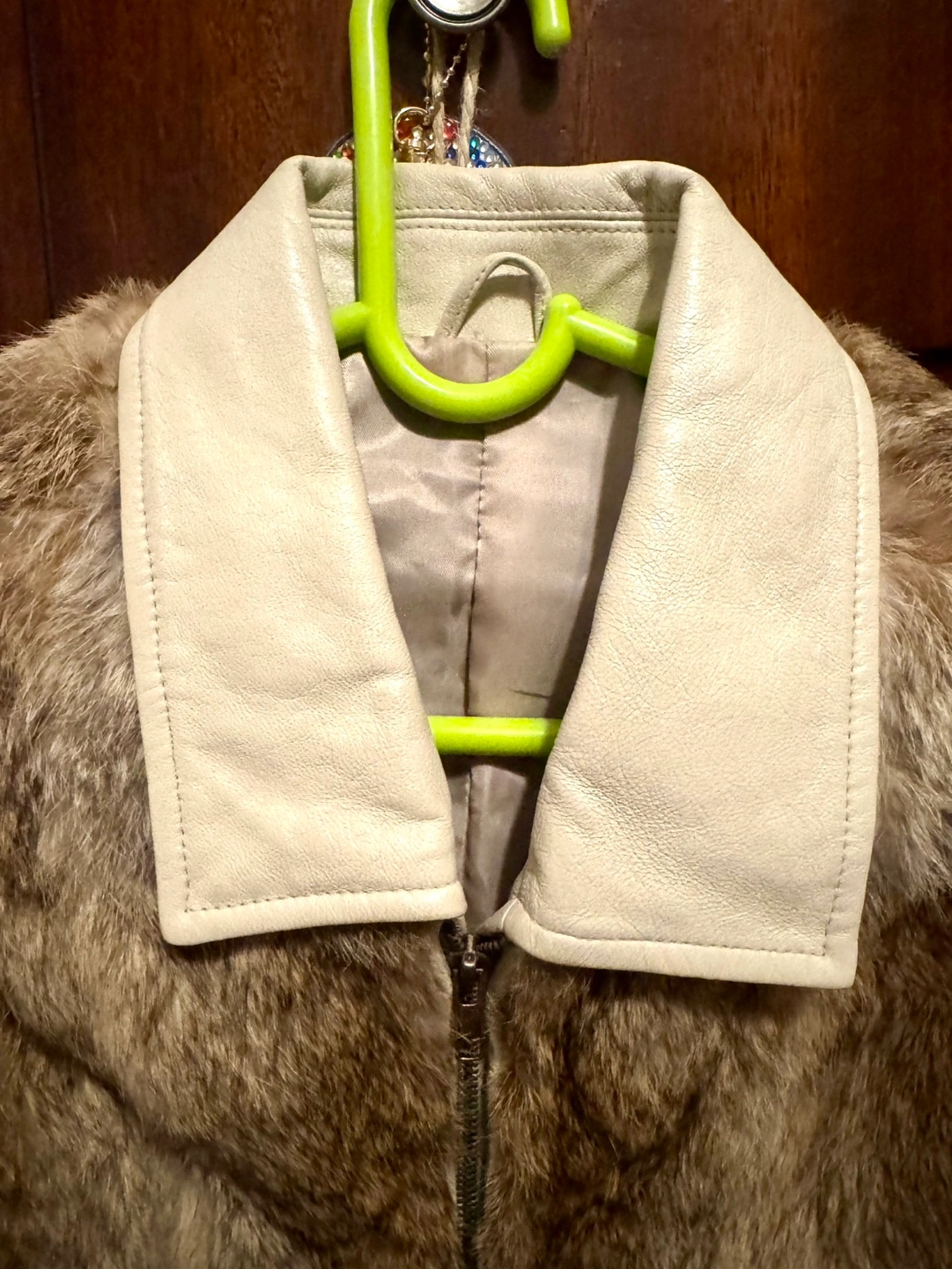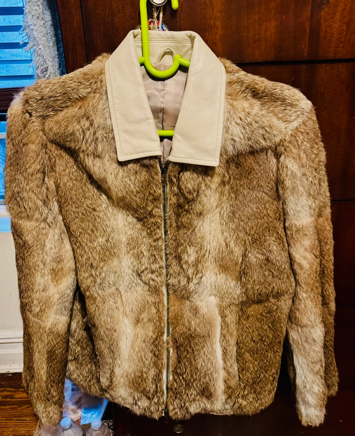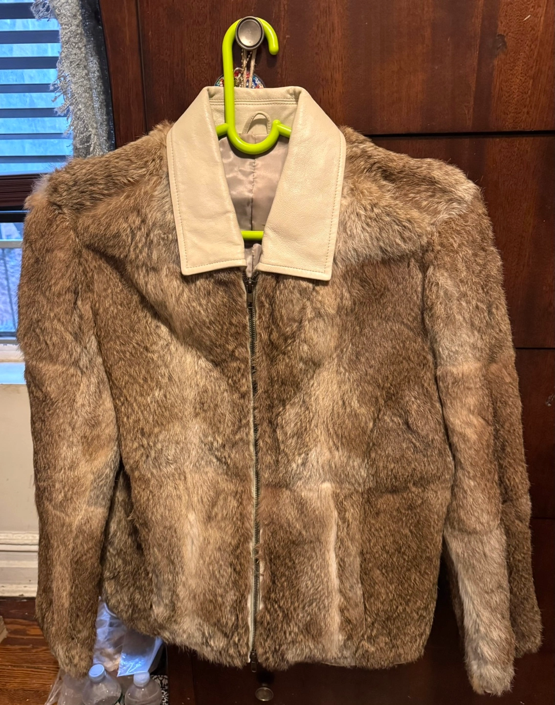 Men’s/women’s Brown rabbit fur jacket. Features a zip-up front and off-white leather collar.