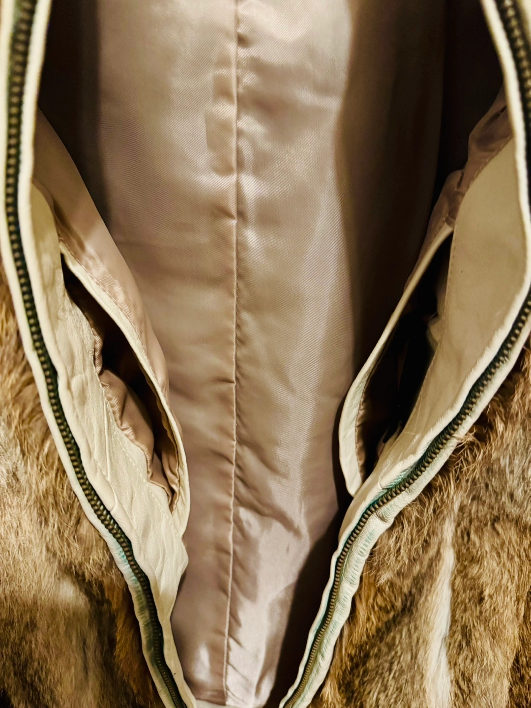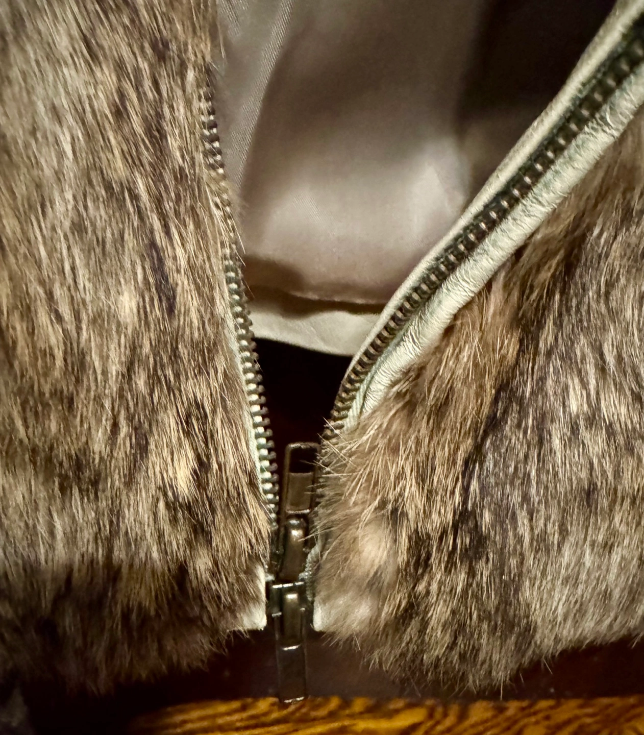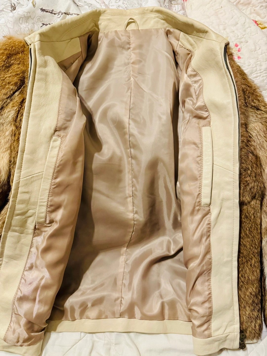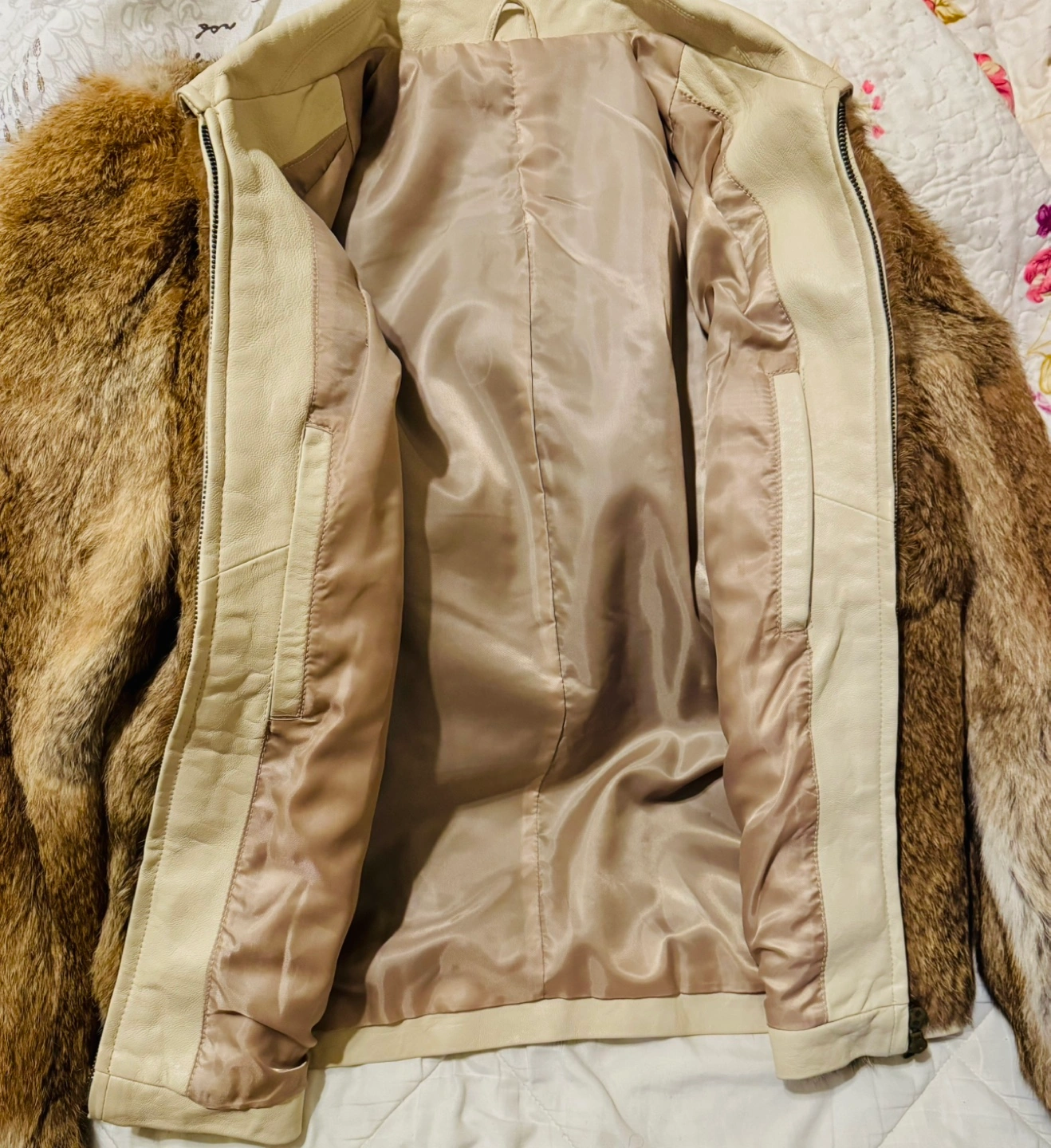 Men’s/women’s Brown rabbit fur jacket. Features a zip-up front and off-white leather collar.