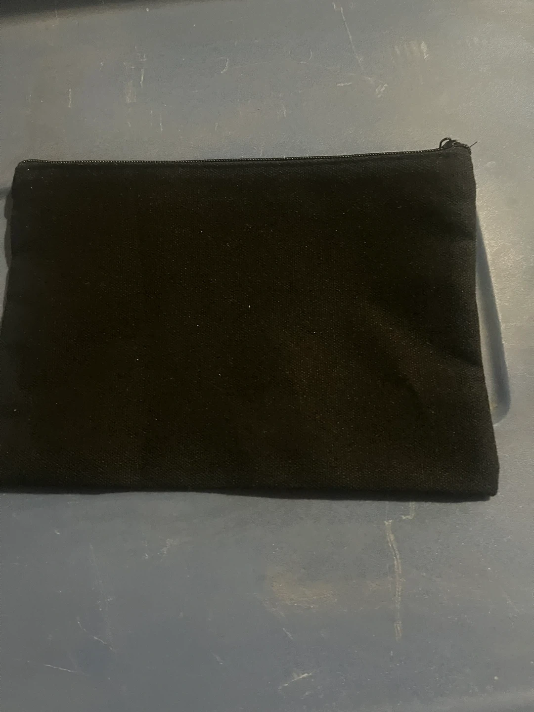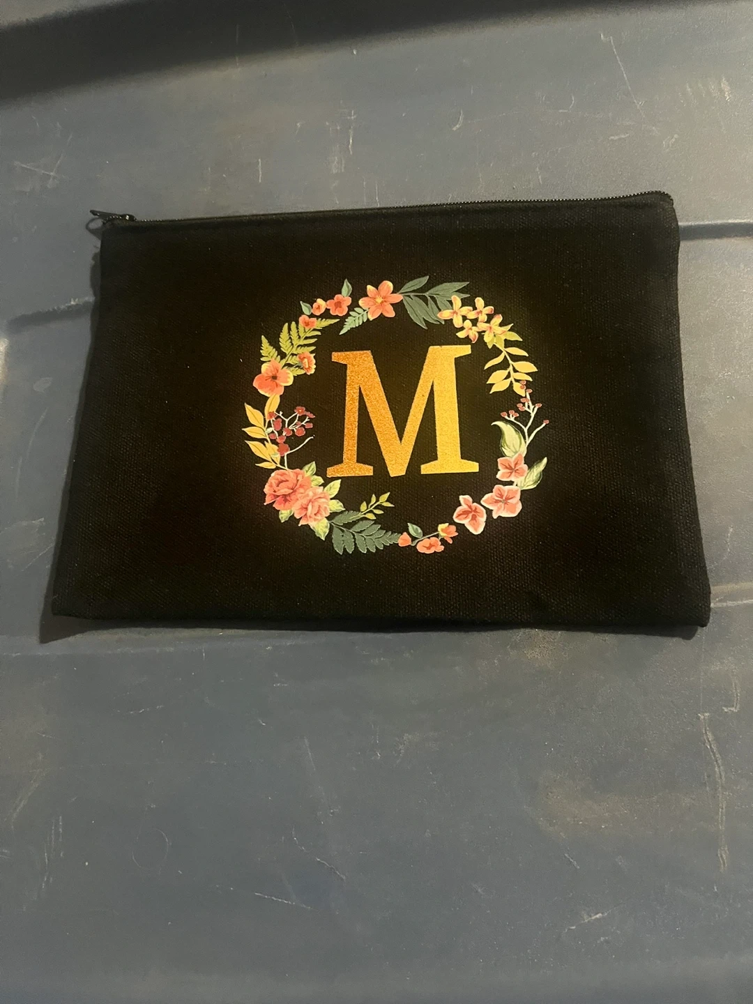 This black canvas pouch features a decorative floral wreath with a large gold 'M' in the centre. It's ideal for organizing small essentials like makeup, pens, or coins. Zipper closure.