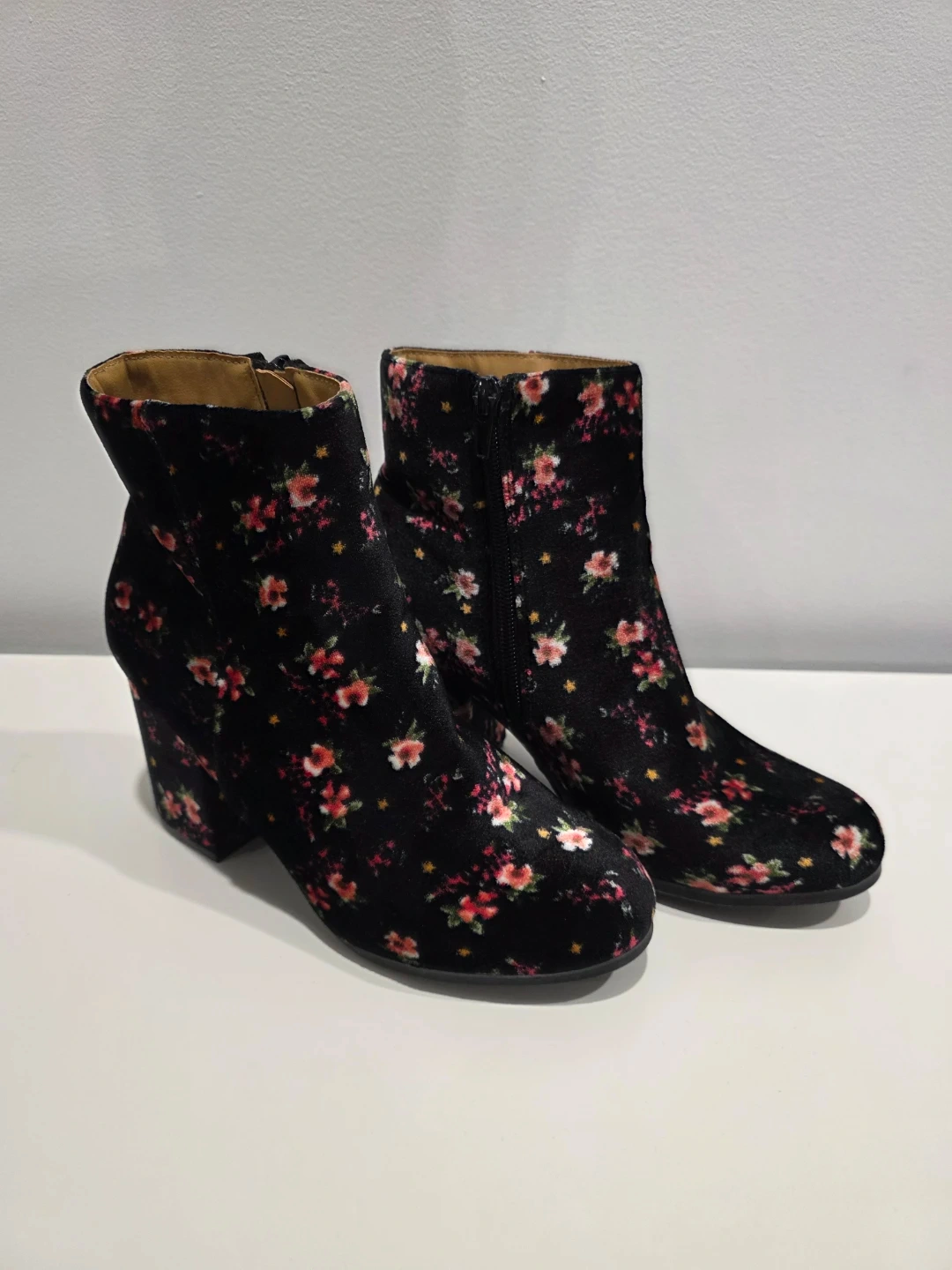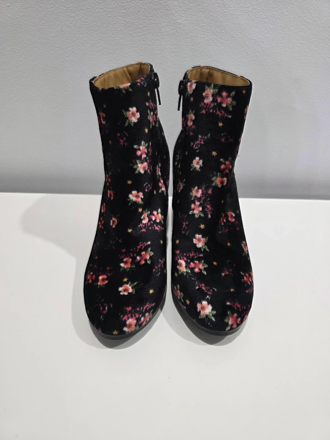 Black velvet ankle boots with a colourful floral print. It's a size 6, made with all man-made materials. These boots zip up the side.