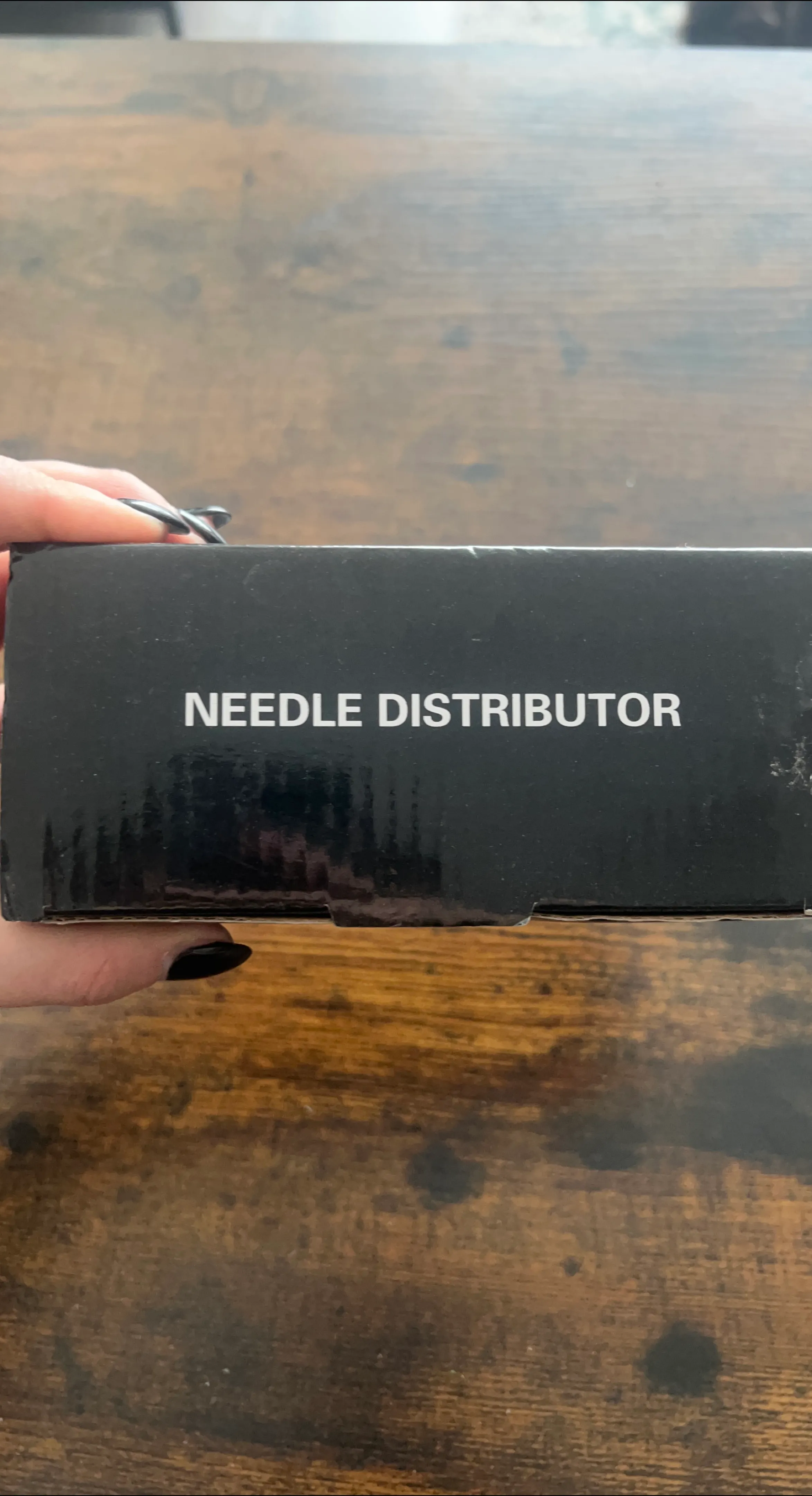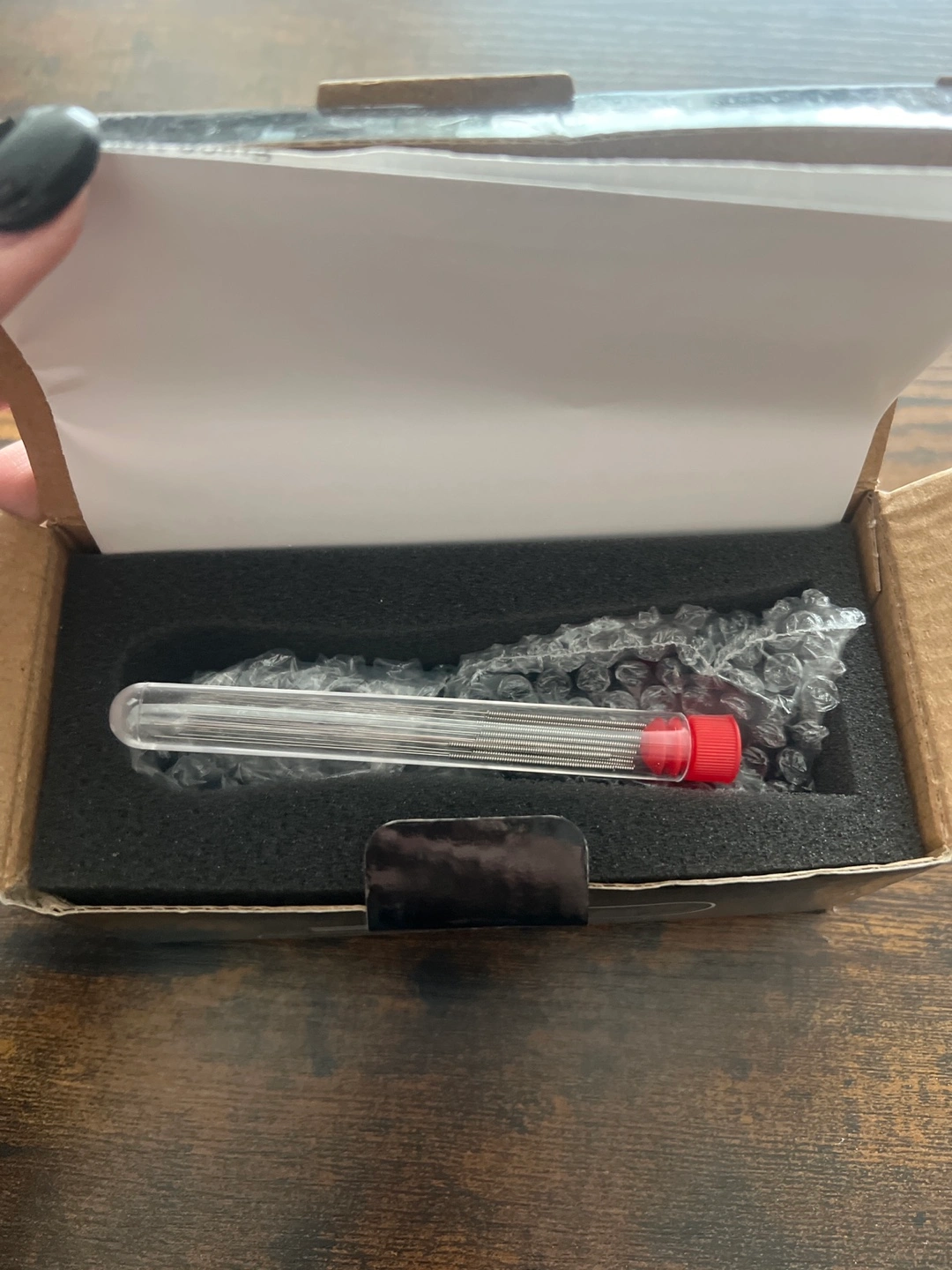 This tool comes with multiple needles for espresso distribution. It includes a user manual with instructions on how to assemble and use it. The needles are stored in a clear tube with a red cap.
