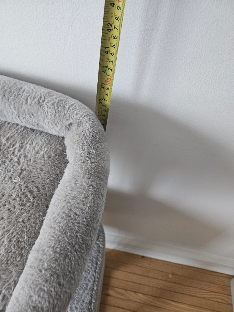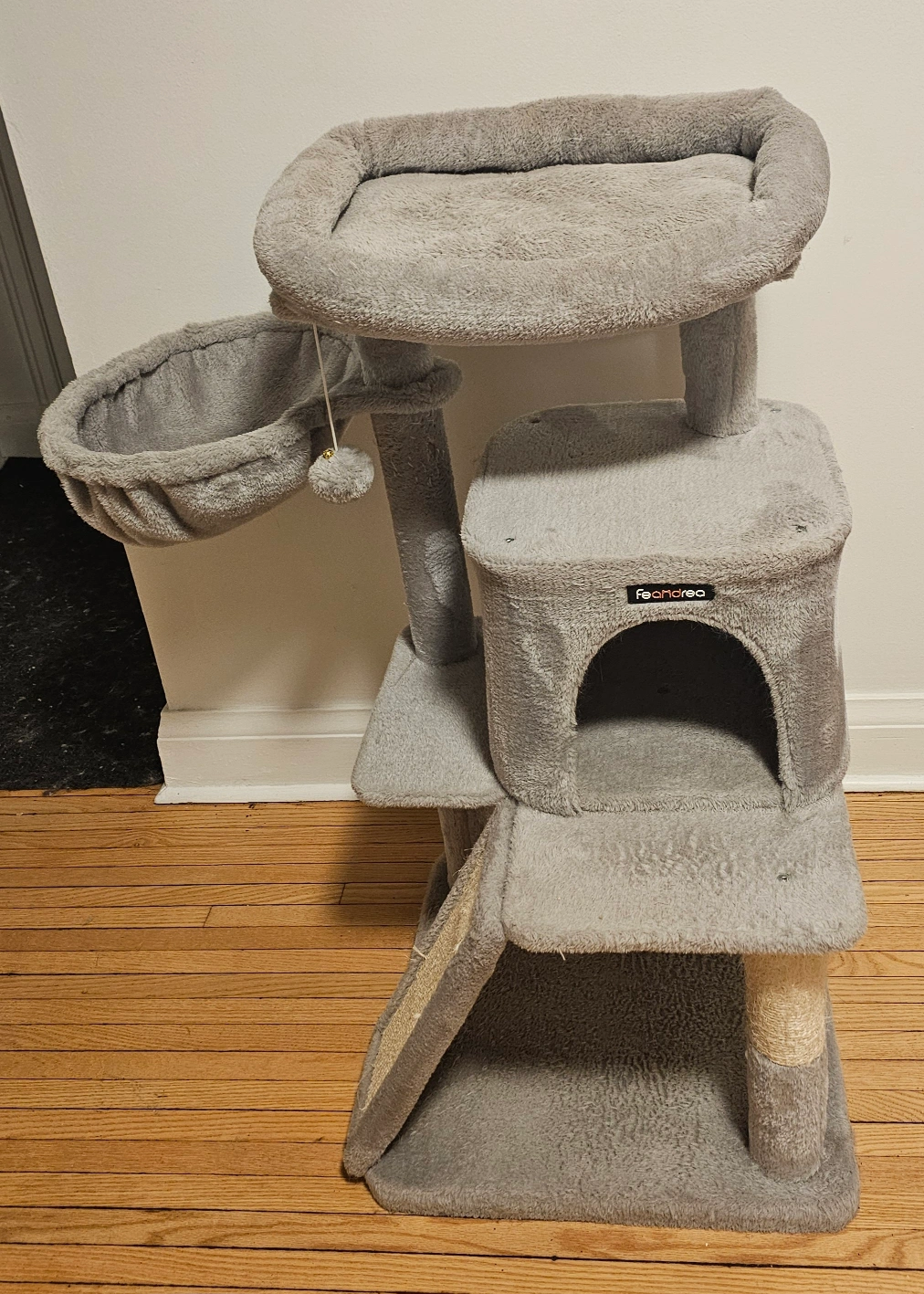 Multi-level cat tree. Grey plush material. Features multiple platforms, a cubby, a hanging toy, and scratching post. Good for cats of all sizes.