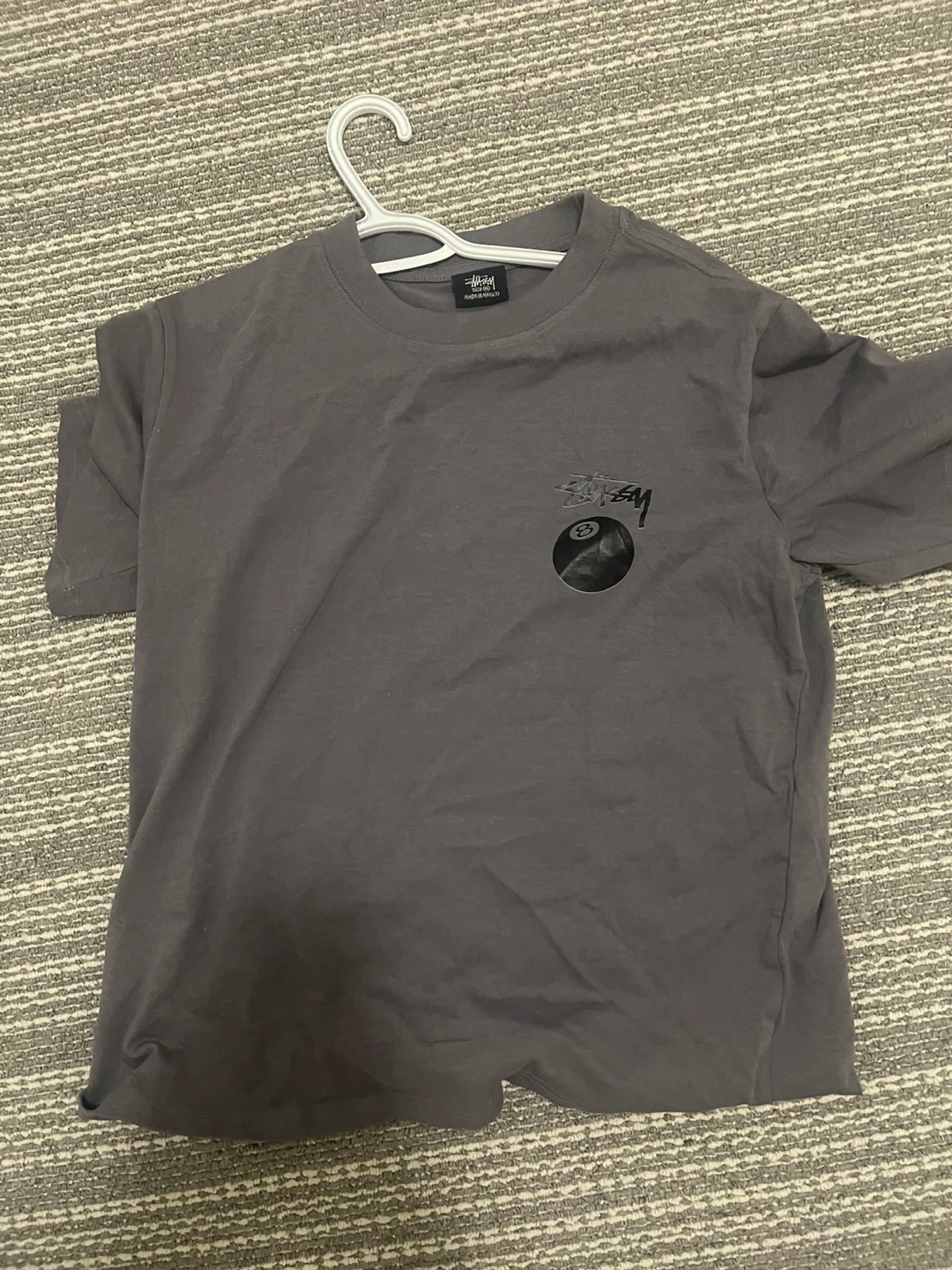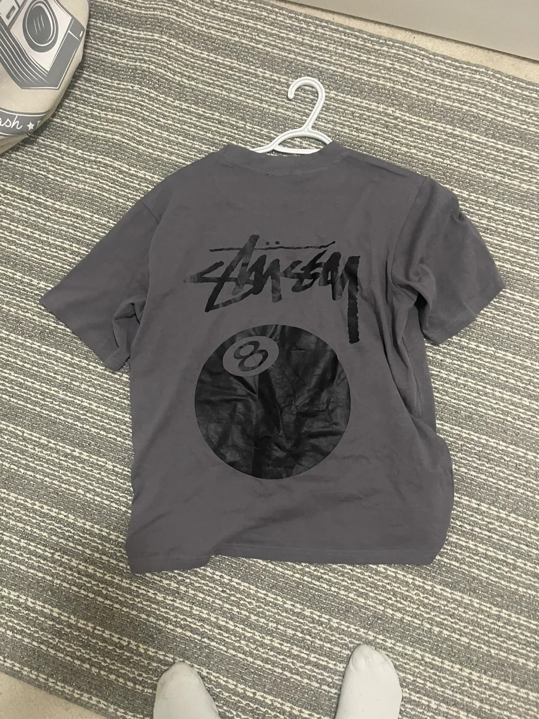 Grey Stüssy t-shirt with the iconic 8 ball graphic on the back. Short sleeves and crew neck. Made of cotton. Worn 3 times