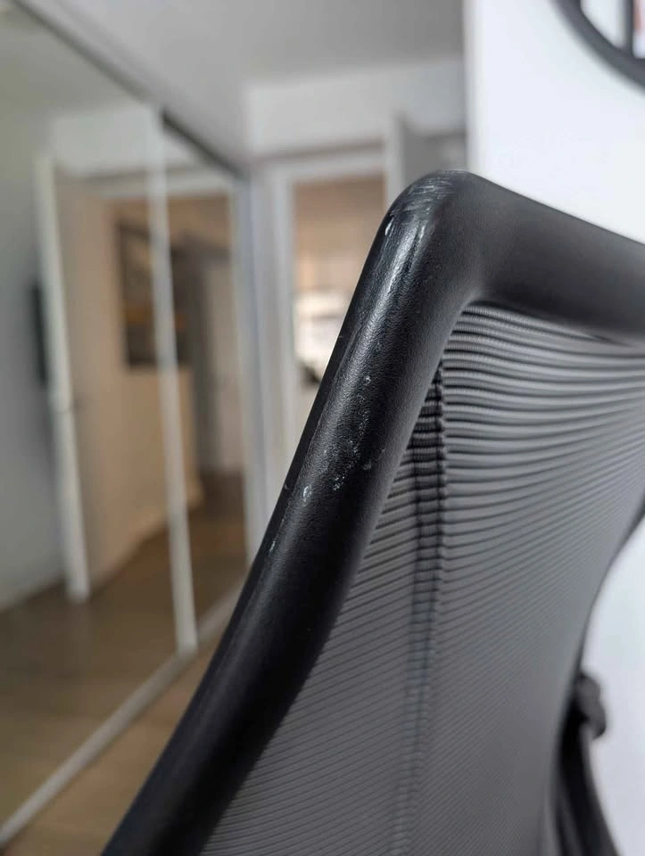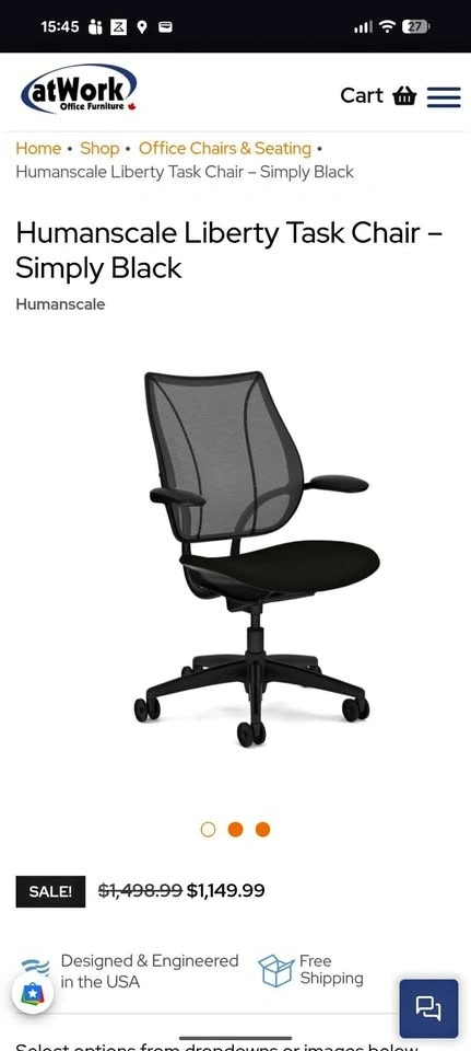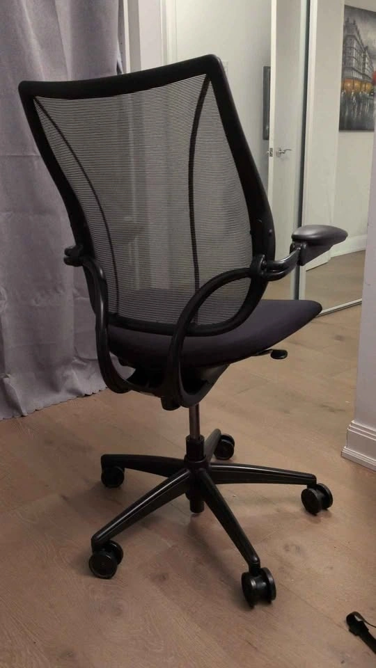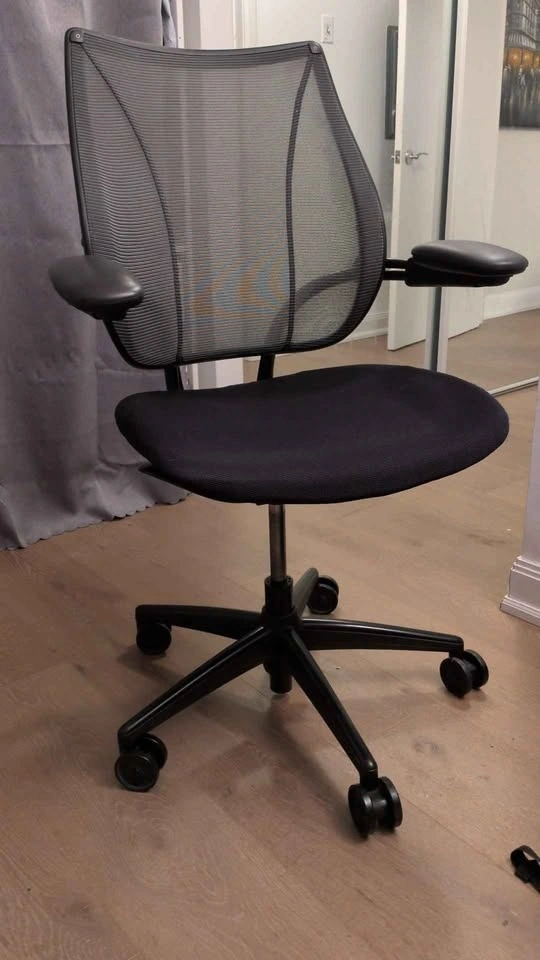 Ergonomic Humanscale Liberty Task Chair in black. Super comfy office chair with a mesh back. Great for long work days! Dimensions are about 38.5"-43.3" tall, seat height 17.7"-22.5" and overall width is 21".