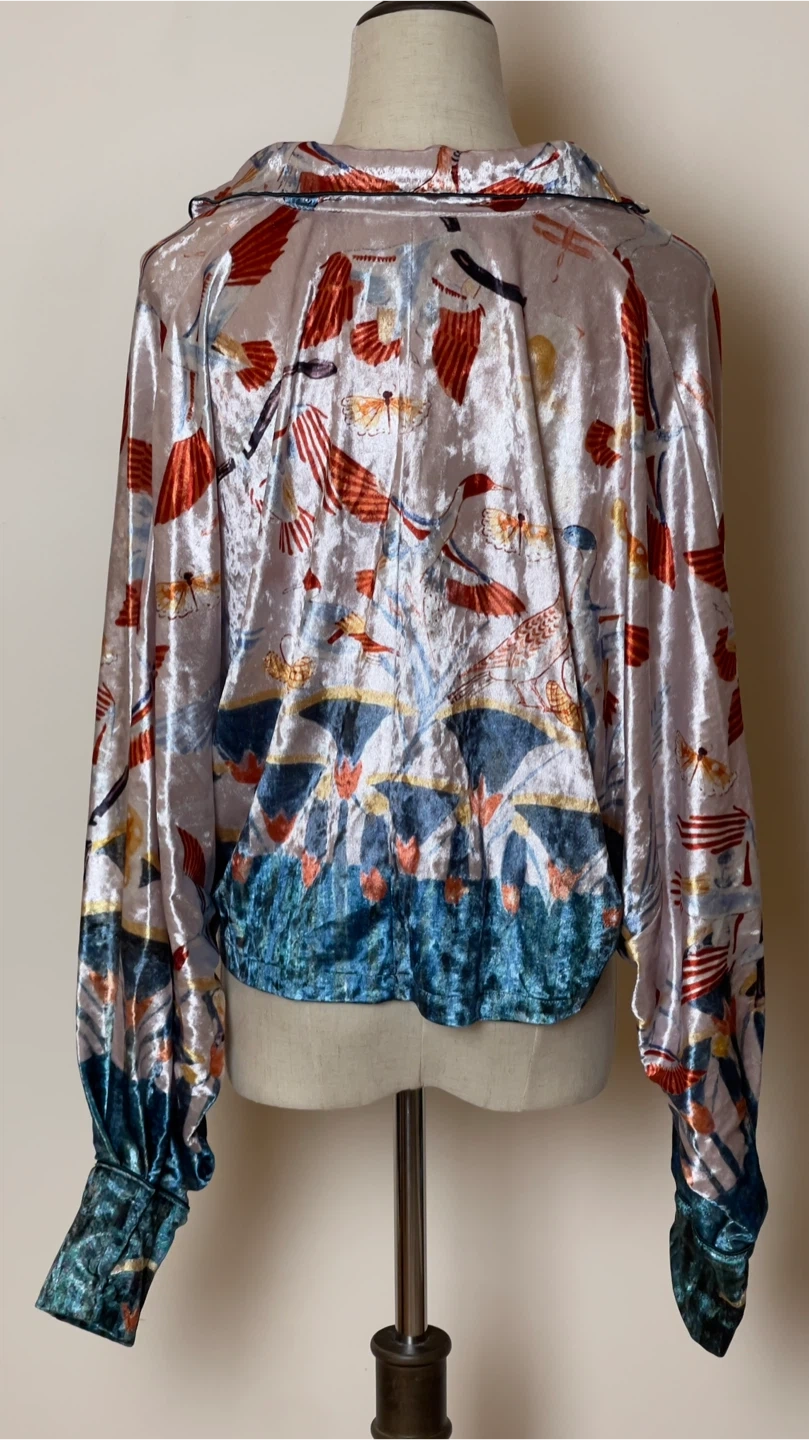 This unique burnout velvet blouse boasts a vibrant, artistic print. It features a classic collared neckline and a relaxed, cropped silhouette. The fabric has a shimmering, iridescent quality with eye-catching blue accents at the hem and cuffs.