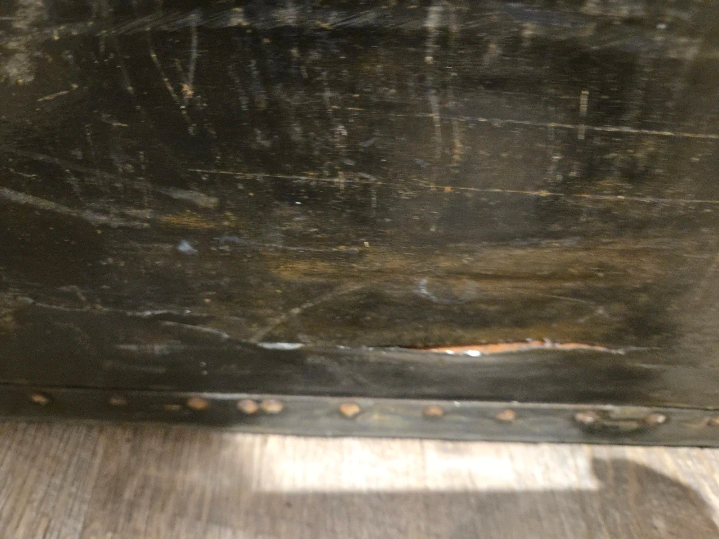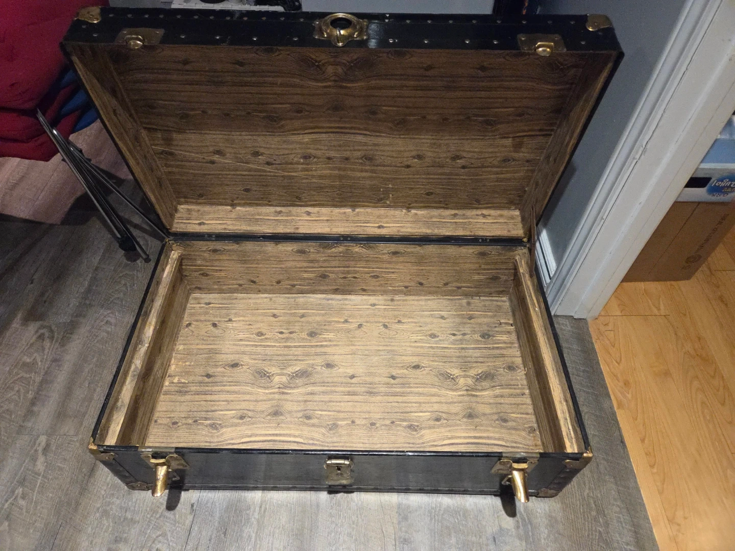 This vintage steamer trunk features a durable black exterior with decorative brass corner protectors and latches. The interior is lined with a wood-grain patterned material, offering a unique retro look. It's perfect for storage or as a decorative piece!