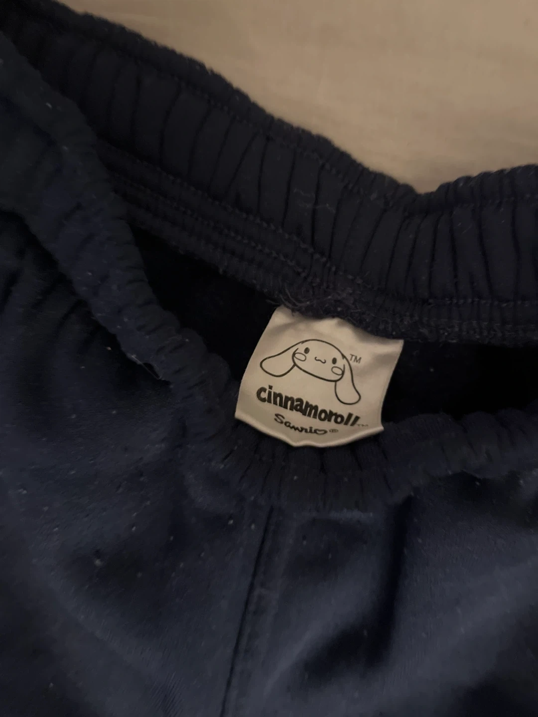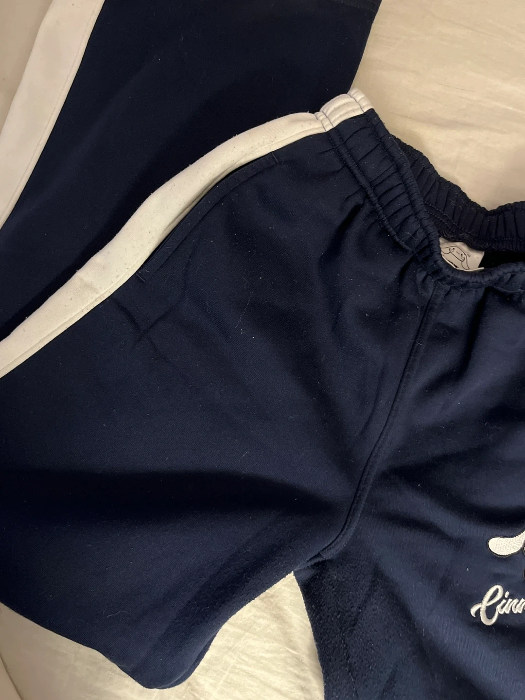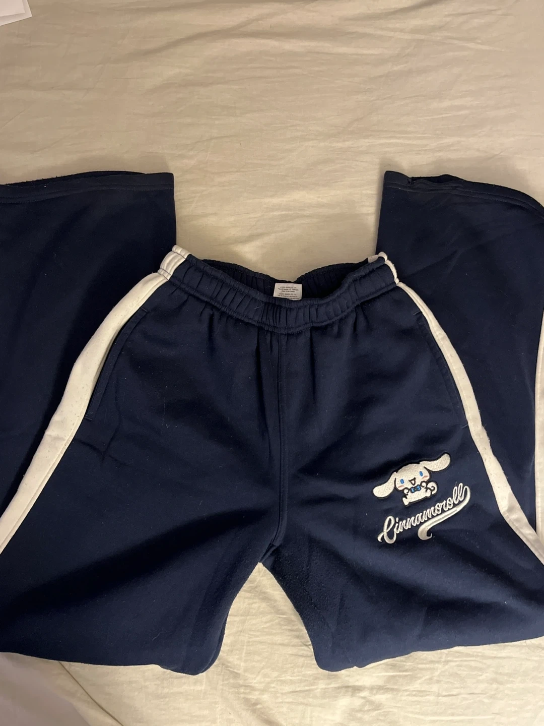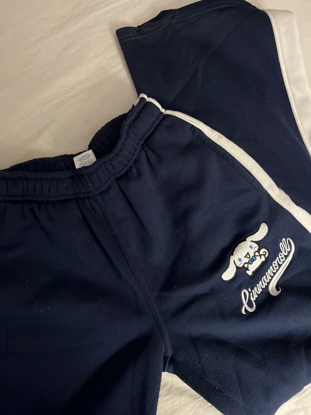 Navy blue track pants featuring a Cinnamoroll graphic. Elastic waistband and white side stripes. Made with a soft fabric. Gives off baggy style, never worn.