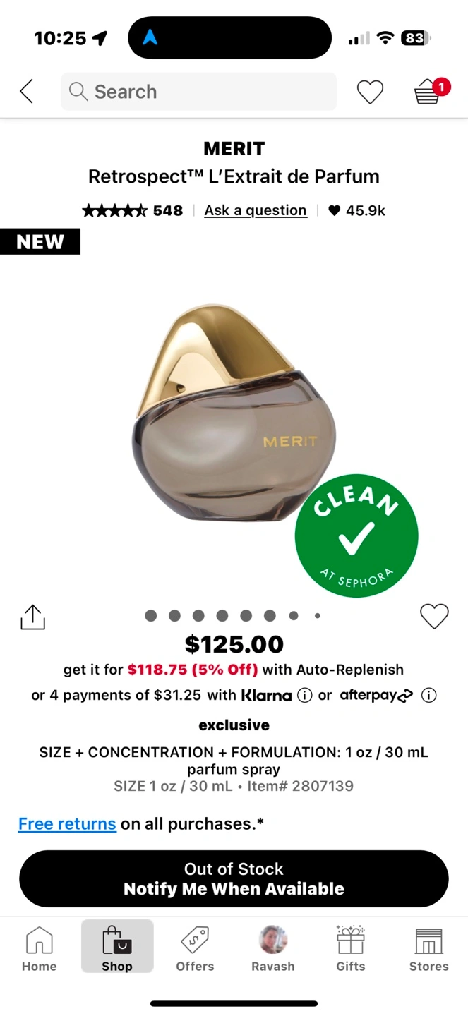 New, unused, full size bottle of MERIT Retrospect™ L’Extrait de Parfum. 1 oz/30 mL.
