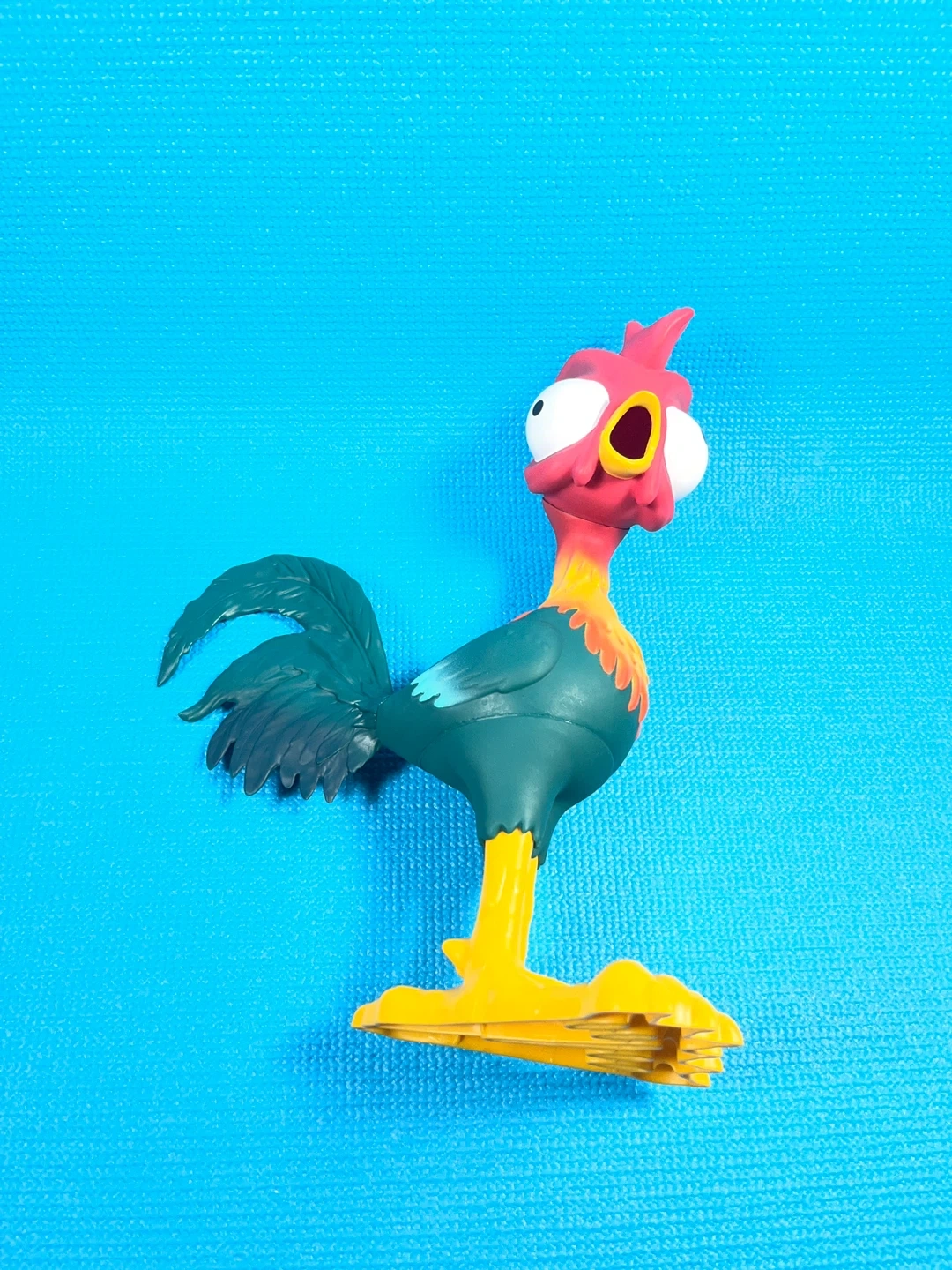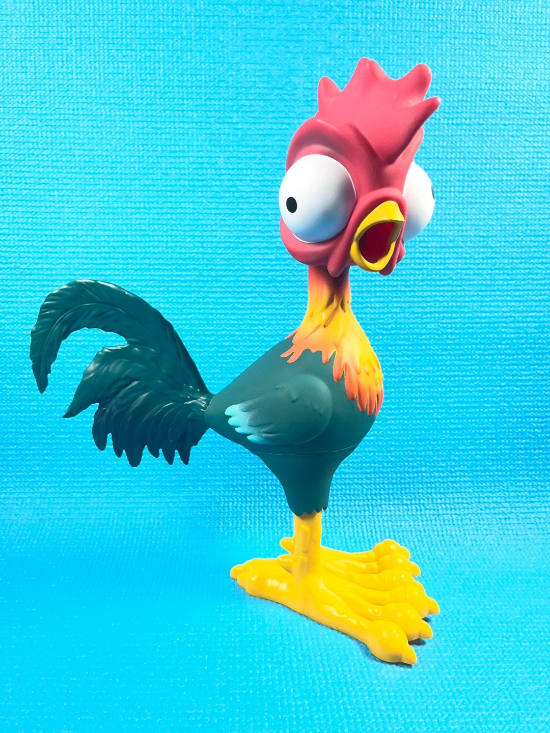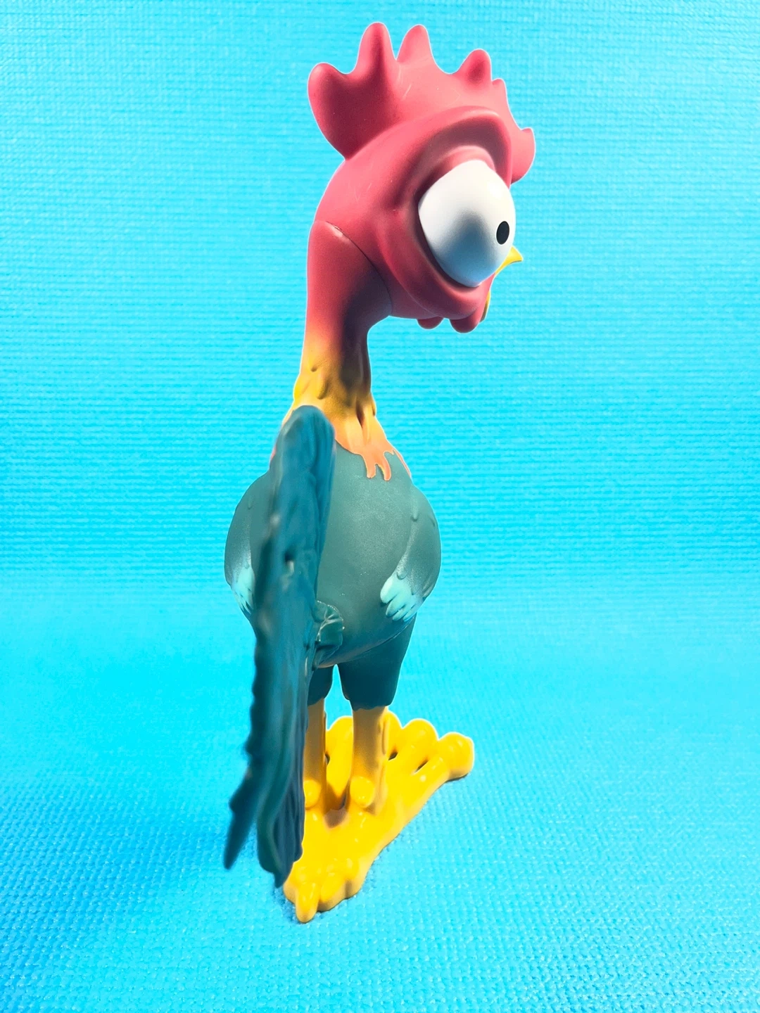 Plastic figure of Hei Hei from Disney's Moana. Red head with large white eyes, yellow beak, and a green body with yellow feet.