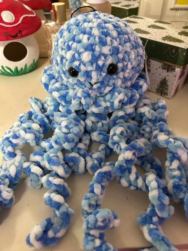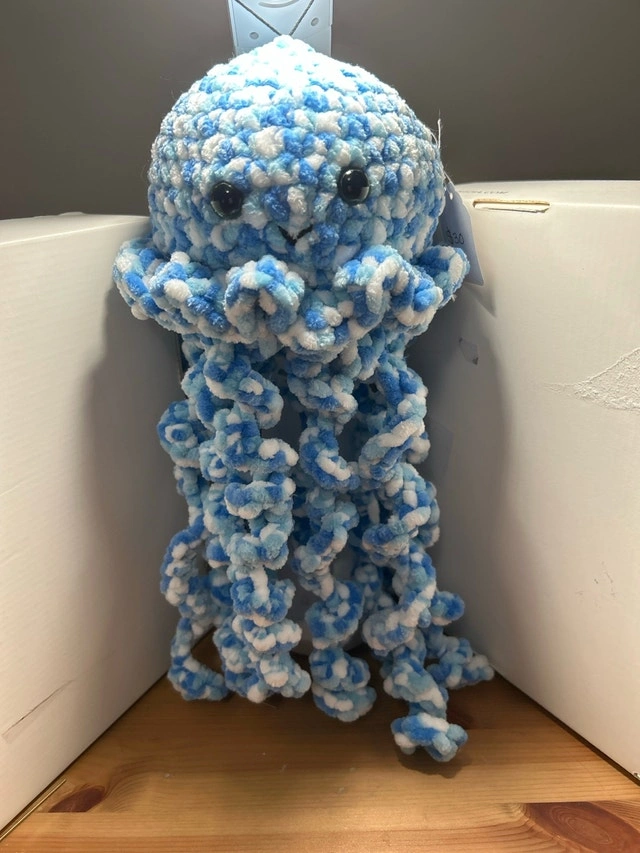 This delightful, handmade jellyfish plush is crafted with super soft, blue and white chenille yarn, making it incredibly cuddly and perfect for kids or anyone who loves adorable sea creatures! It's in excellent condition and comes from a smoke-free home. Looking for a cuddly companion that's a bit out of the ordinary? This jumbo jellyfish is ready to bring some underwater charm to your life! Cash accepted.