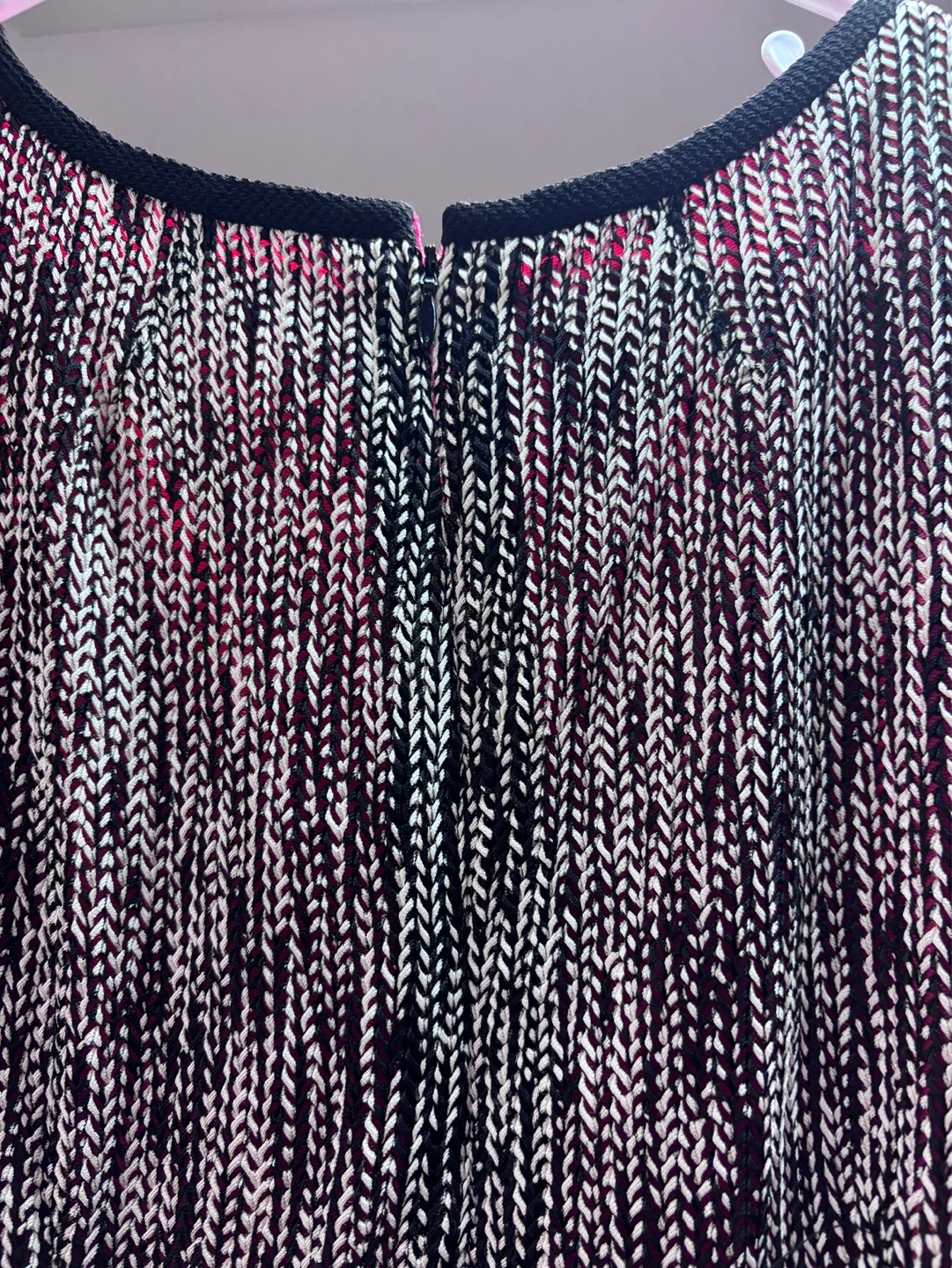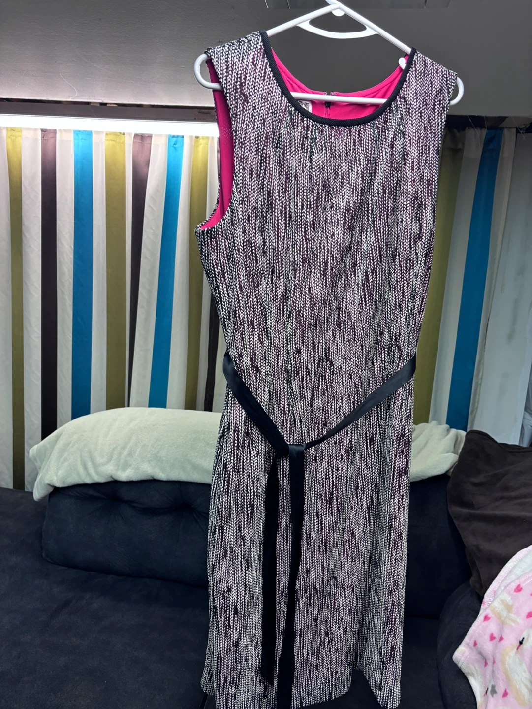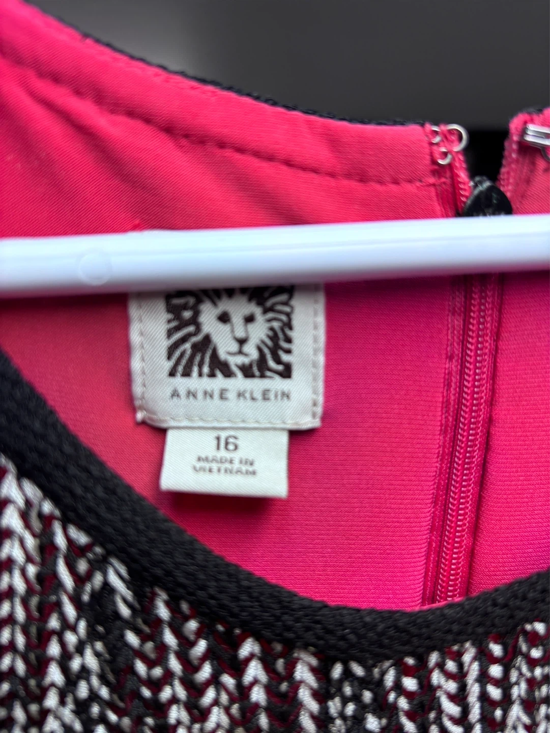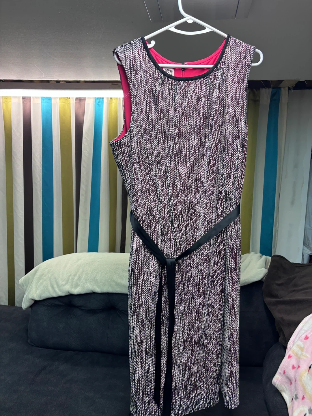 This is an Anne Klein sleeveless dress in size 16. It features a patterned fabric with a black tie belt. The lining is bright pink. Worn once for a wedding. Lightweight and comfortable with an invisible zipper. Classic black and white with a pop of colour for an extra bit of personality!
