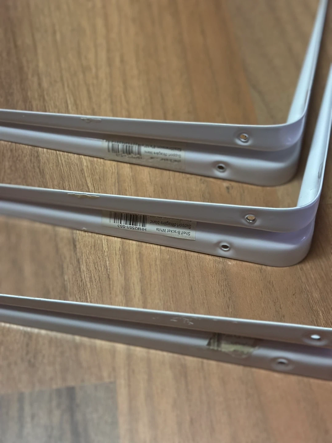 Selling a set of three white shelf brackets. They're in good condition and ready to help you organize your space. Perfect for adding some extra storage to any room in your home.