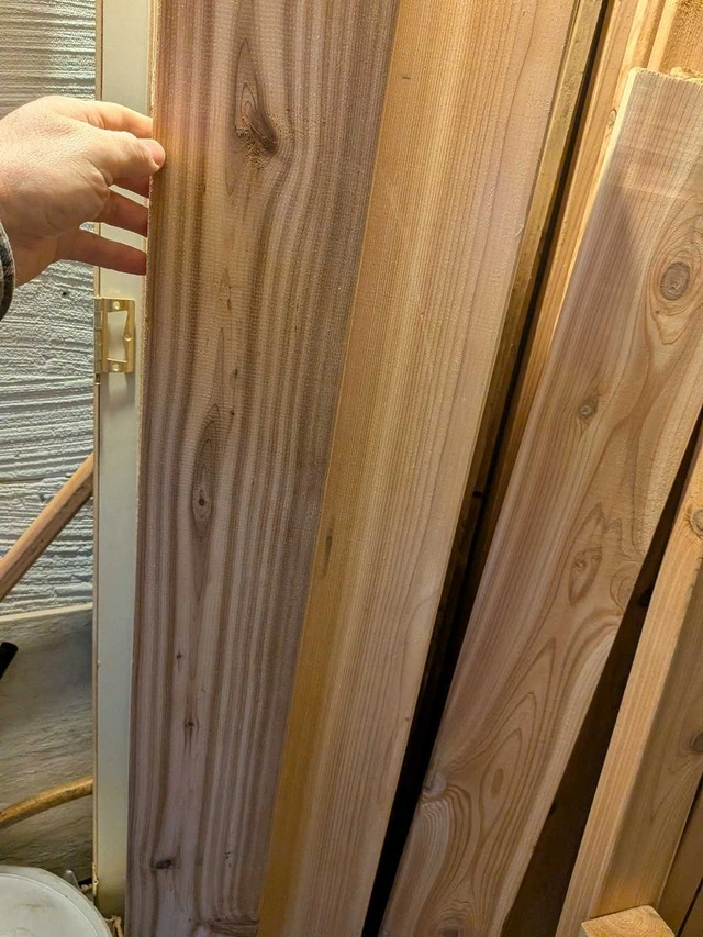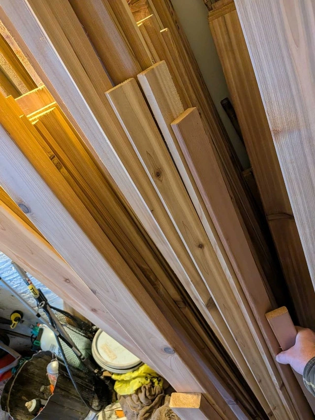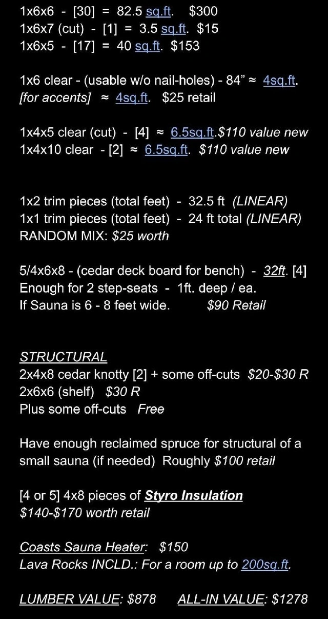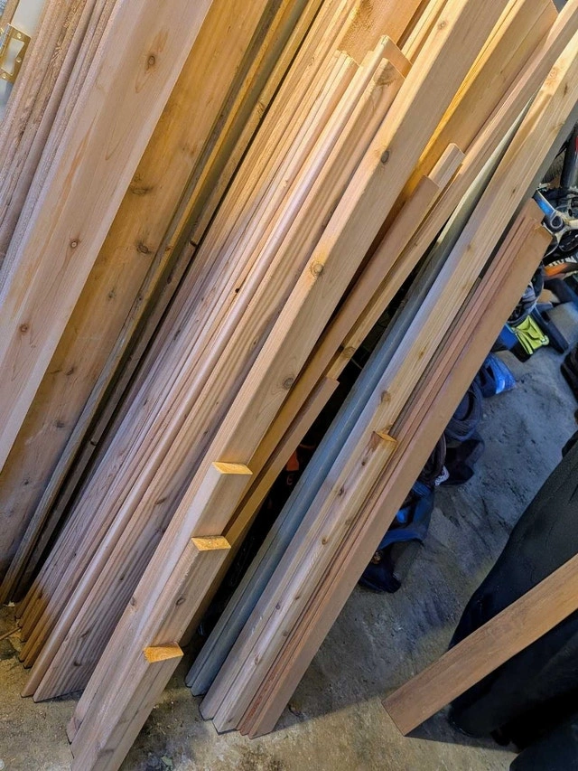Selling cedar lumber planks, measuring 1"x6"x6', knotty and clear cedar mix, totaling approximately 140 square feet. This includes about 40 fence boards, plus some 2x6's and 2x4's. They've been stored inside for the past 4 years and are in very clean condition. Suitable for building a small sauna, a sauna bench, or light cedar furniture and outdoor seating. I also have insulation and a sauna heater available if you're interested in a DIY sauna project. If the ad is up, they are still available. Specs listed. Great Value! We also build Saunas and other Eco Builds. Feel free to ask about the materials you need or our services. Please call or text if interested. Serious inquiries only. Cash accepted. Cashless payment accepted.
