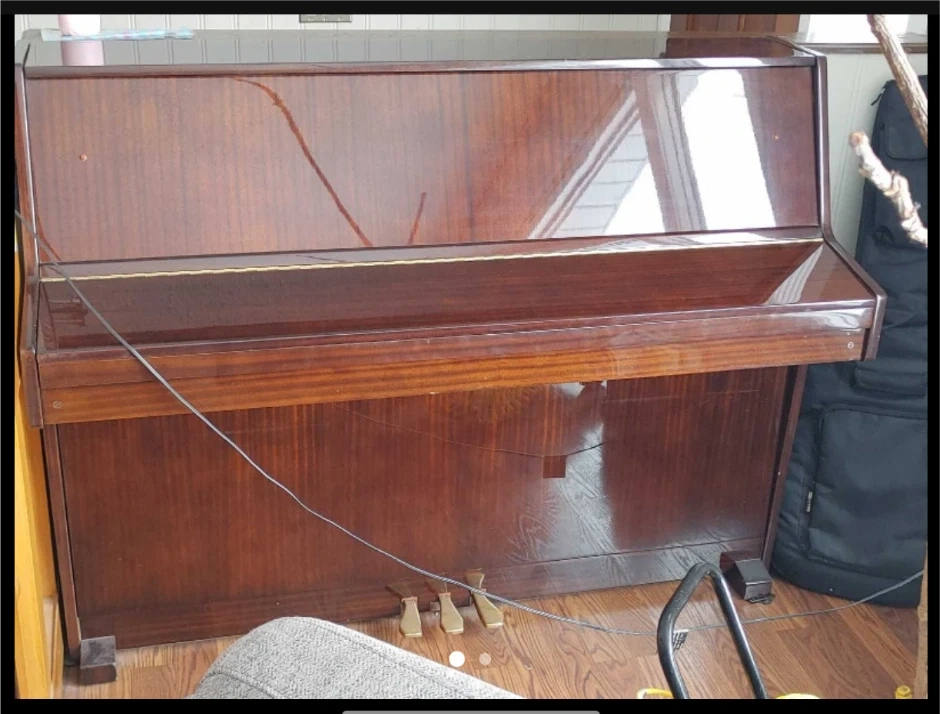 A beautiful wooden upright piano. It features a rich, polished finish. Comes with matching bench. Model E-102.