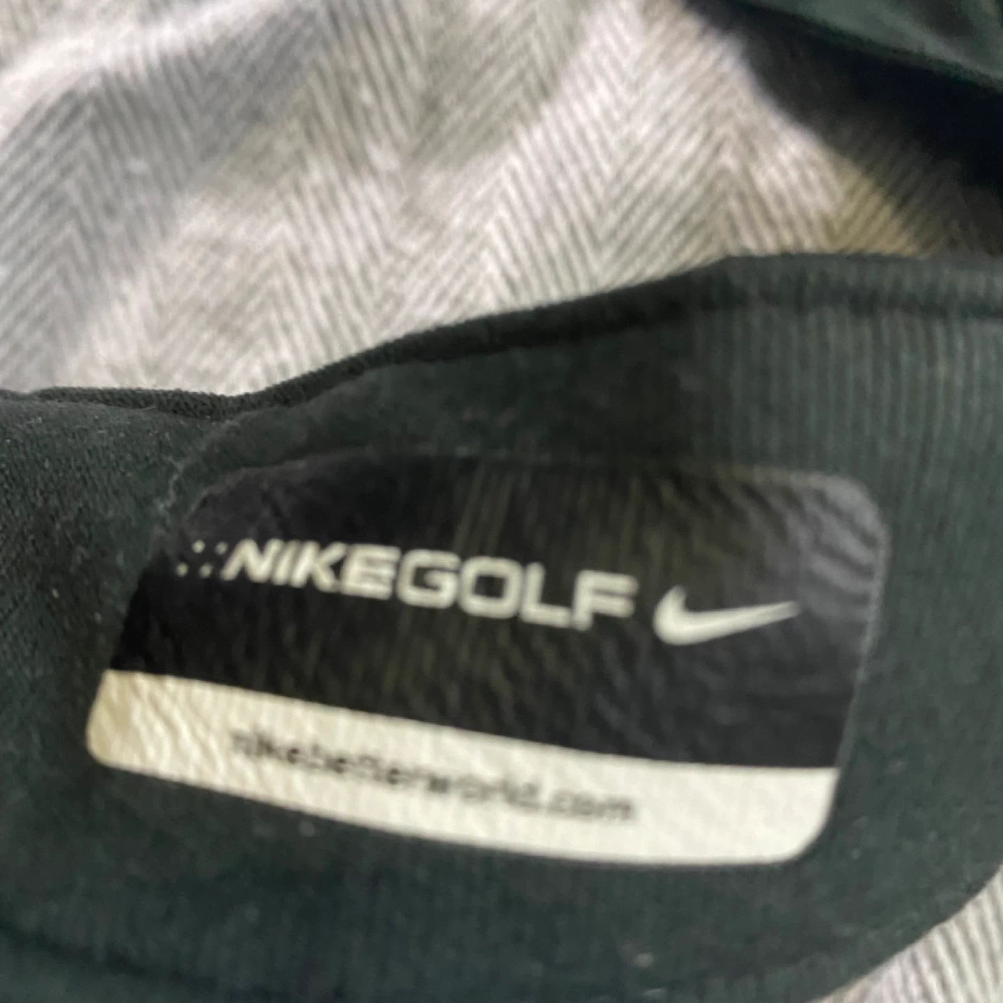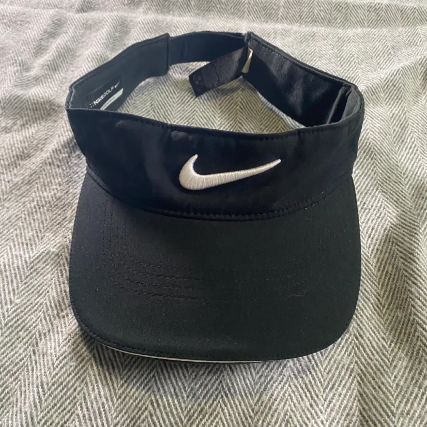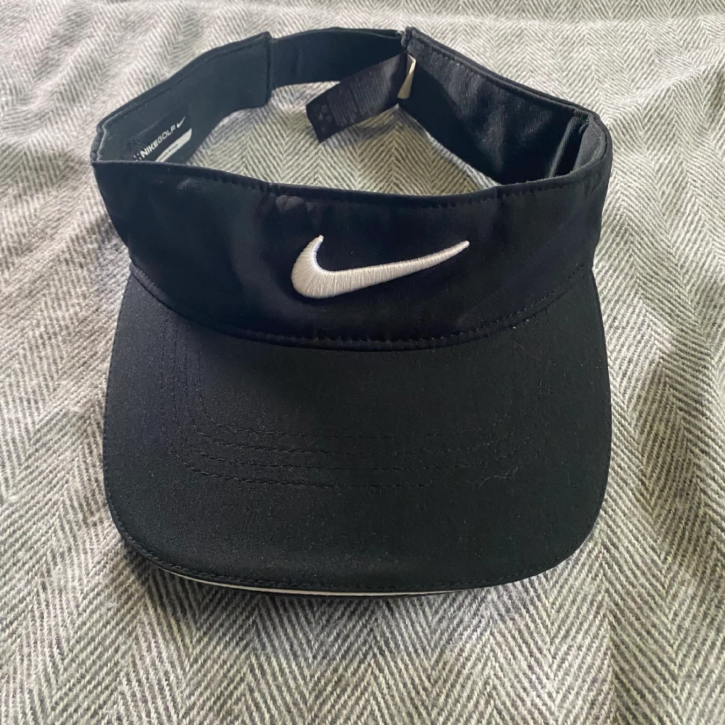 Black Nike Golf visor with adjustable strap. Features the Nike swoosh logo. Great for sunny days on the course!