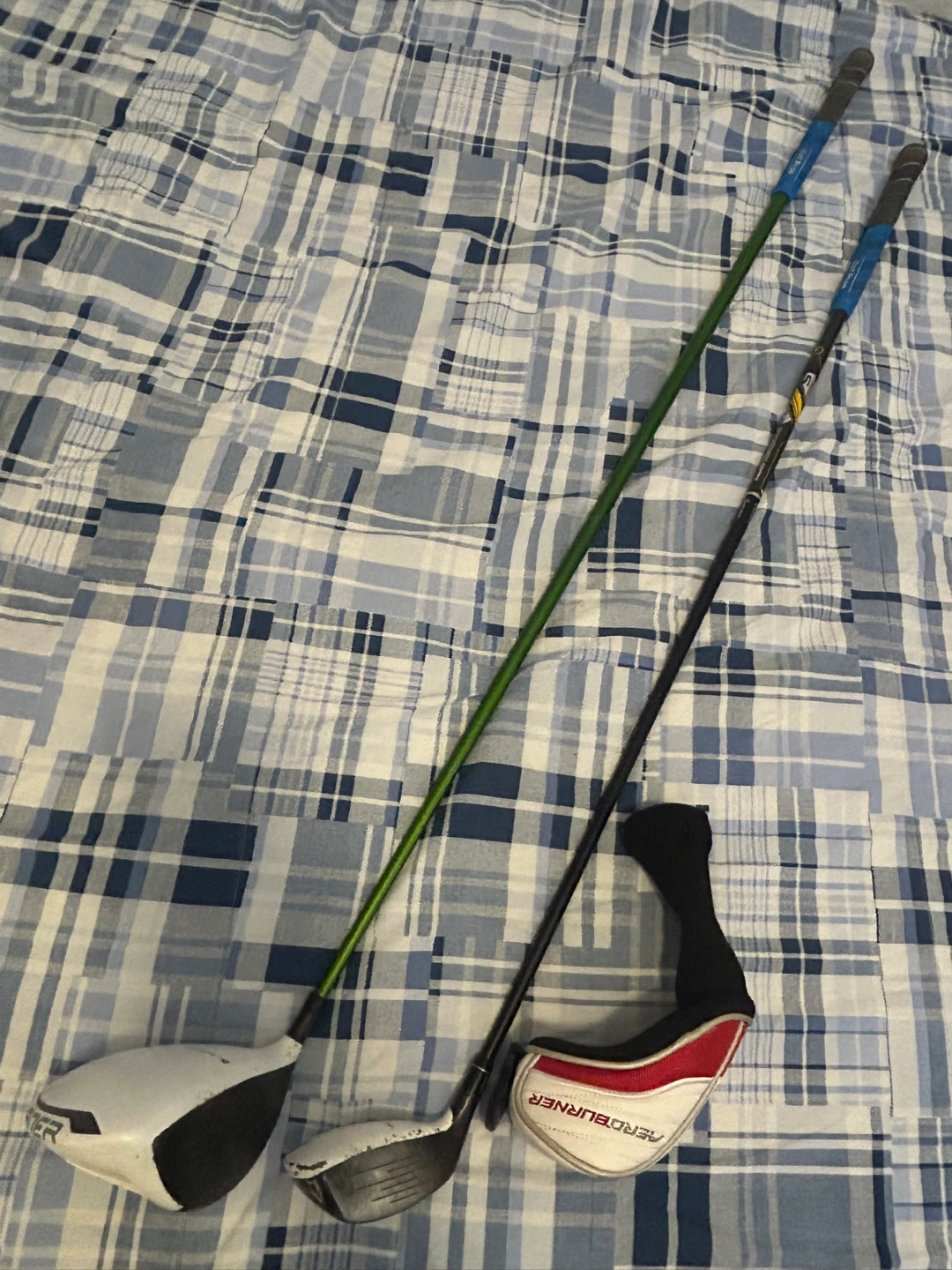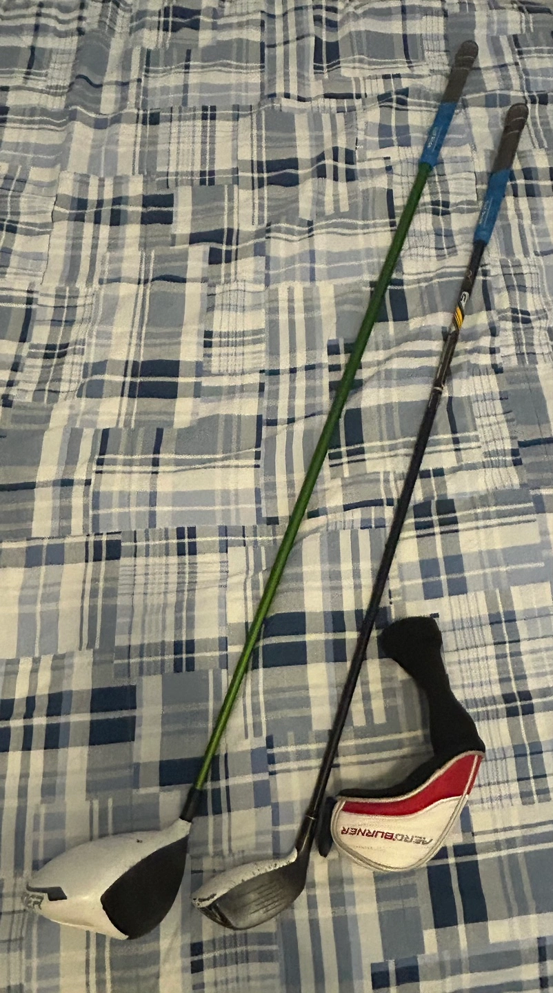 Includes a TaylorMade Burner SuperFast 2.0 driver and a TaylorMade AeroBurner rescue club. Both clubs are in used condition. A protective headcover is included for the rescue club.