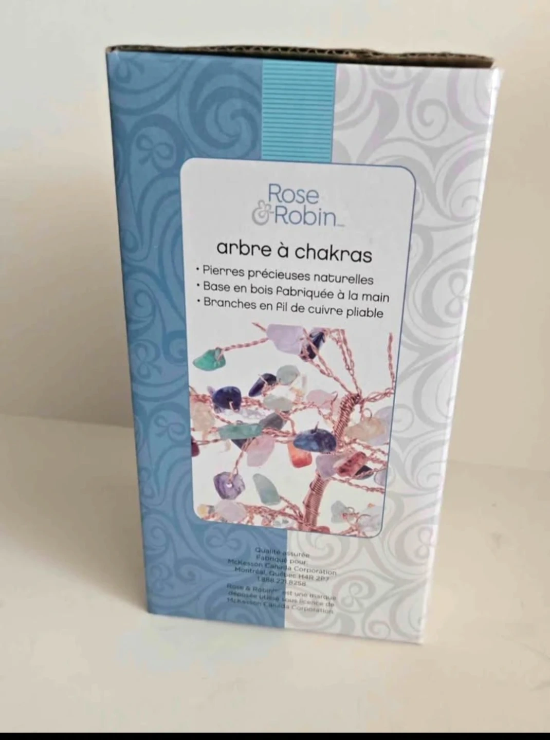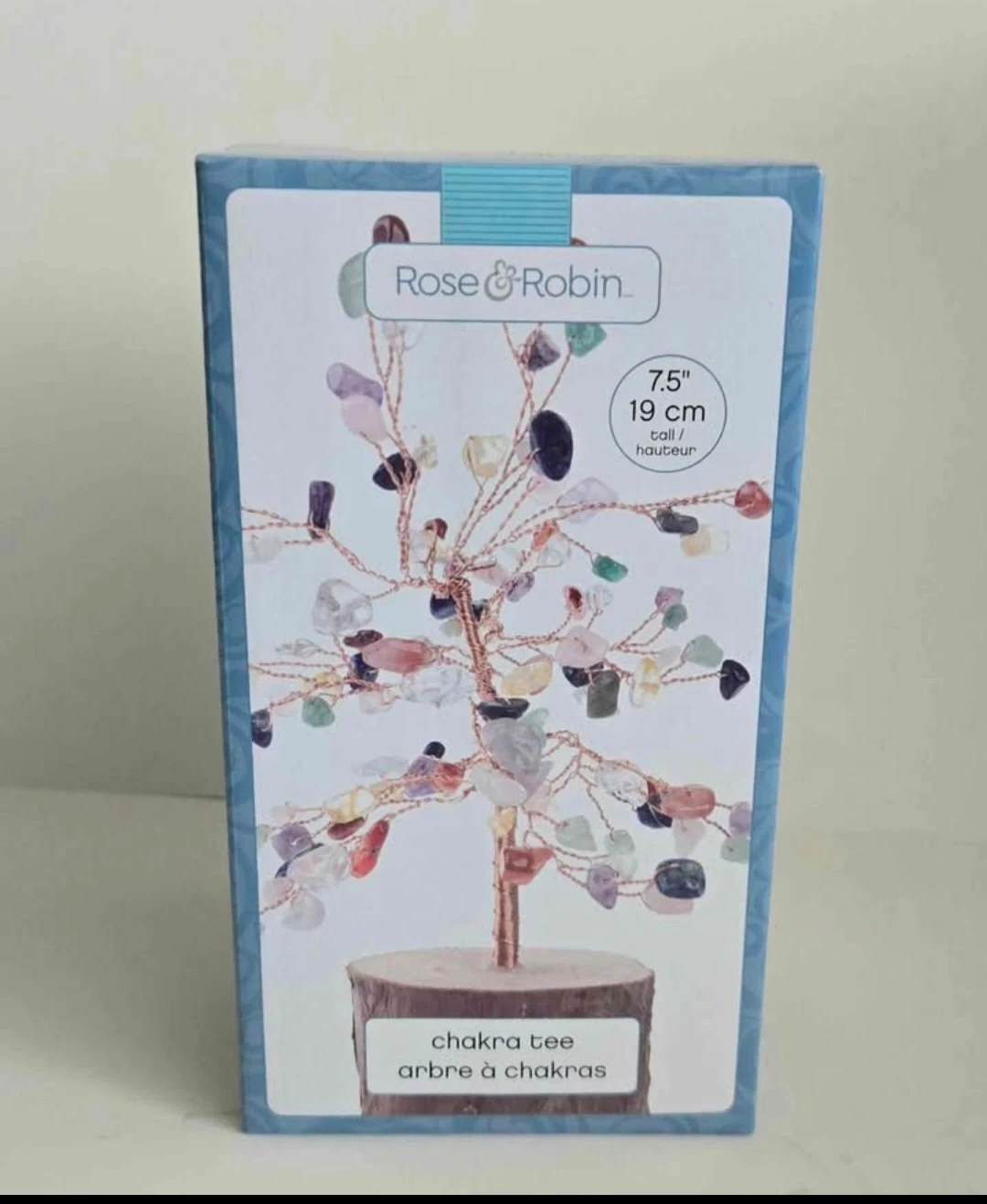 Rose & Robin handcrafted Chakra Tree. Features healing gemstones representing seven of the body's chakras. It's 7.5" (19 cm) tall and made with a wooden base and pliable copper wire branches. Use it for meditation or to promote positive energy.