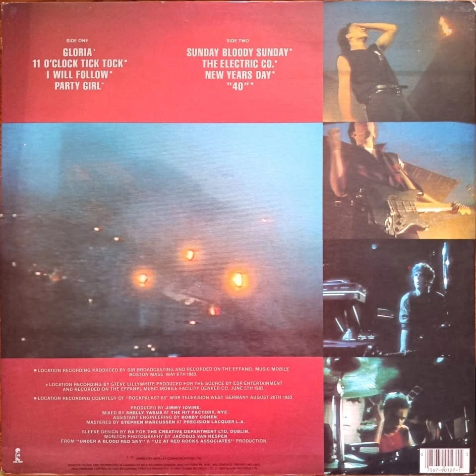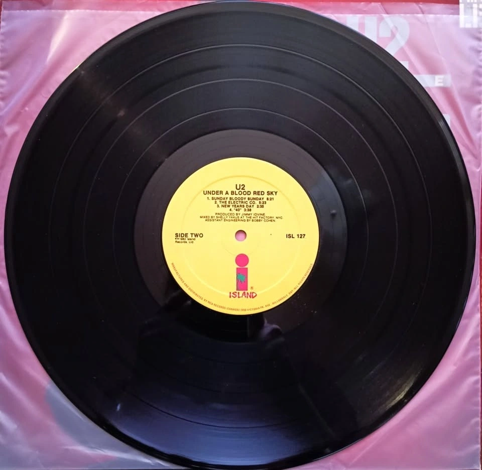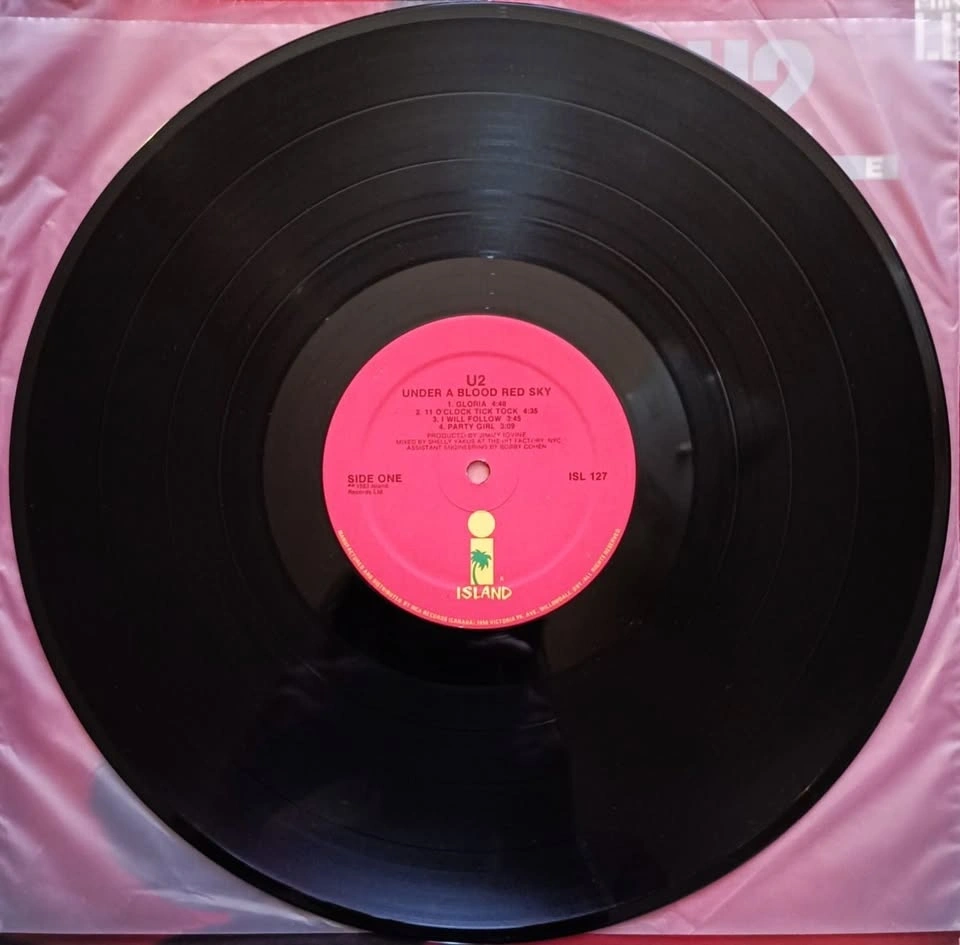 This is a copy of U2's live mini-LP "Under A Blood Red Sky" (Canadian re-issue, with red & yellow labels, Island Records - ISL-127) in VG+ condition. The cover is also in VG+ condition, despite a couple of corner dings. Side A: 1. Gloria, 2. 11 O'Clock Tick Tock, 3. I Will Follow, 4. Party Girl. Side B: 1. Sunday Bloody Sunday, 2. The Electric Co., 3. New Years Day, 4. "40". Price is firm (discount may apply to multiple purchases - please see my other items for sale!). No shipping. Available at a safe, public meet-up in downtown Kitchener.