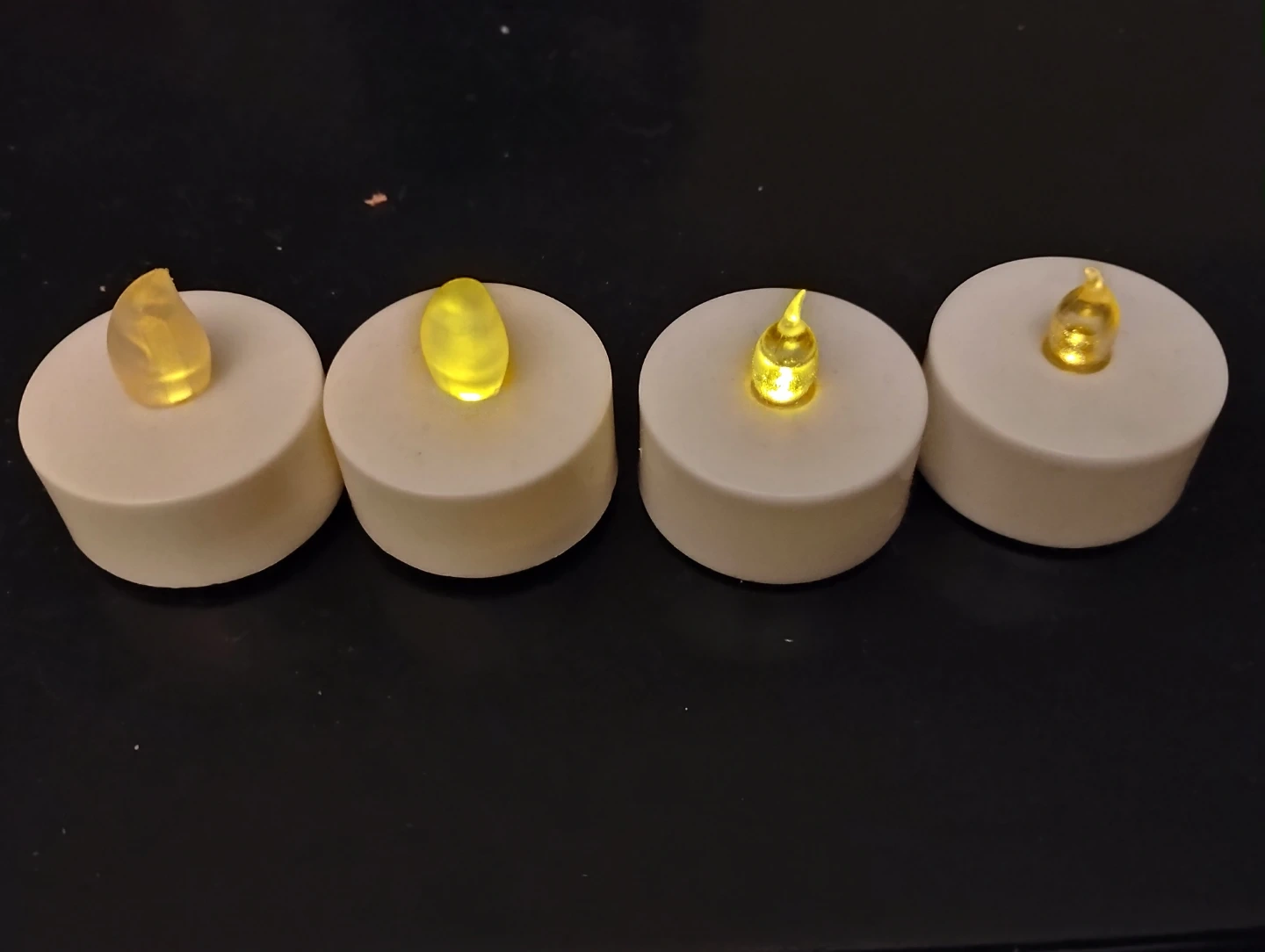 4 LED VOTIVE LIGHTS/CANDLES. IN WORKING ORDER, AS YOU SEE IN THE PICTURE WHEN THE PICTURE WAS TAKEN. TWO HAVE CLEAR FLAMES, TWO HAVE FROSTED.