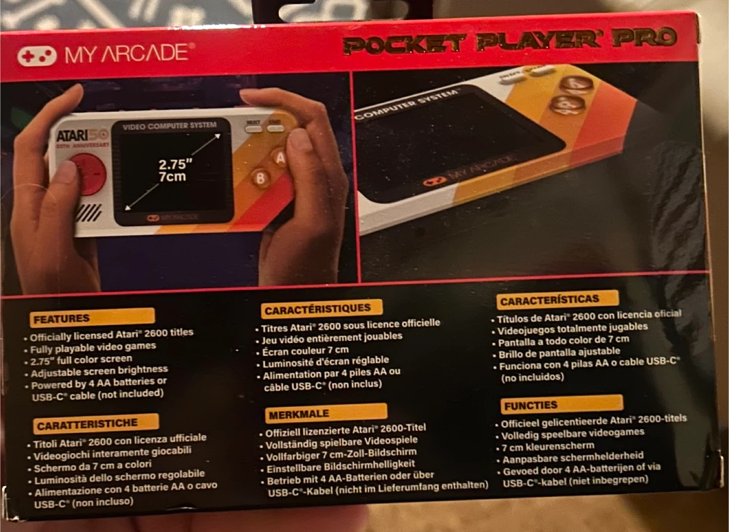 Selling a brand new, in-box My Arcade Atari Pocket Player Pro! It's the 50th Anniversary edition and comes with 100 games. This portable gaming system has a 2.75" full colour screen and adjustable screen brightness. It can be powered by 4 AA batteries or a USB-C cable Not included