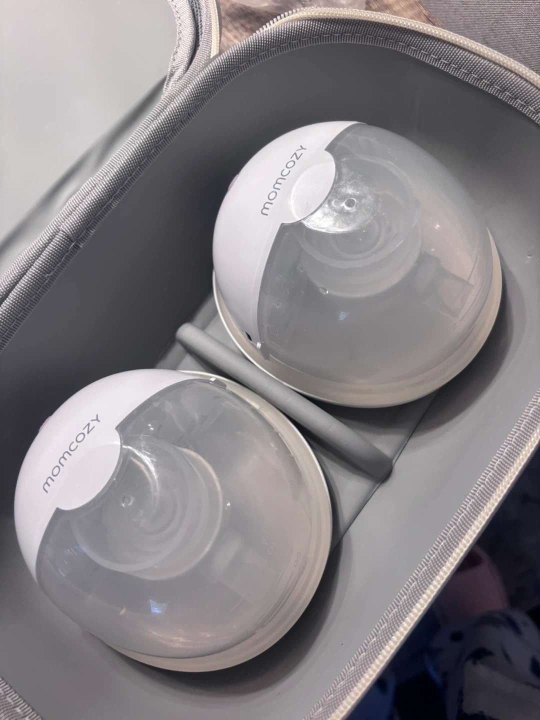This is a Momcozy wearable breast pump set. It includes two pumps and comes in a grey carrying case. Instructions for assembly are included.