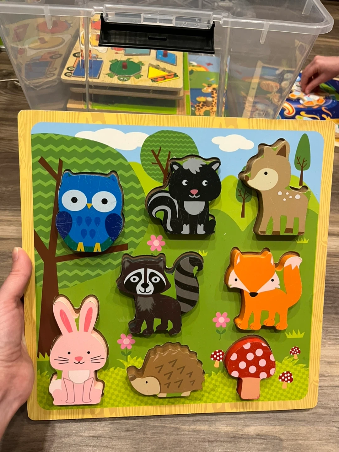 This wooden peg puzzle features cute forest animals like an owl, skunk, deer, raccoon, fox, rabbit, and hedgehog. It's a great way for little ones to develop fine motor skills and learn about animals. The puzzle is made of durable wood with easy-to-grasp pegs.