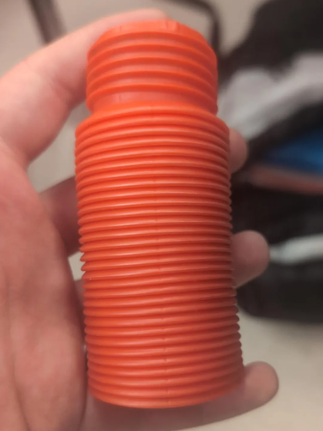 This is an orange plastic vibrating tube toy. It's made of flexible, ribbed plastic. It's a fun sensory toy for fidgeting!