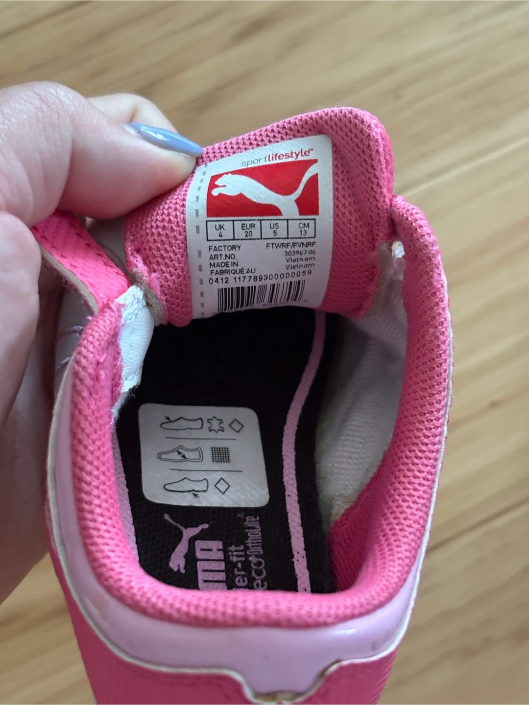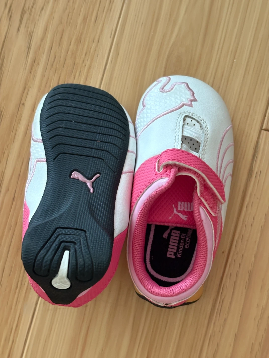 These adorable Puma sneakers are perfect for your little one! They're in great condition and feature a cute pink and white design. The size is US 5T. They have a velcro strap for easy on and off. Perfect for your baby!