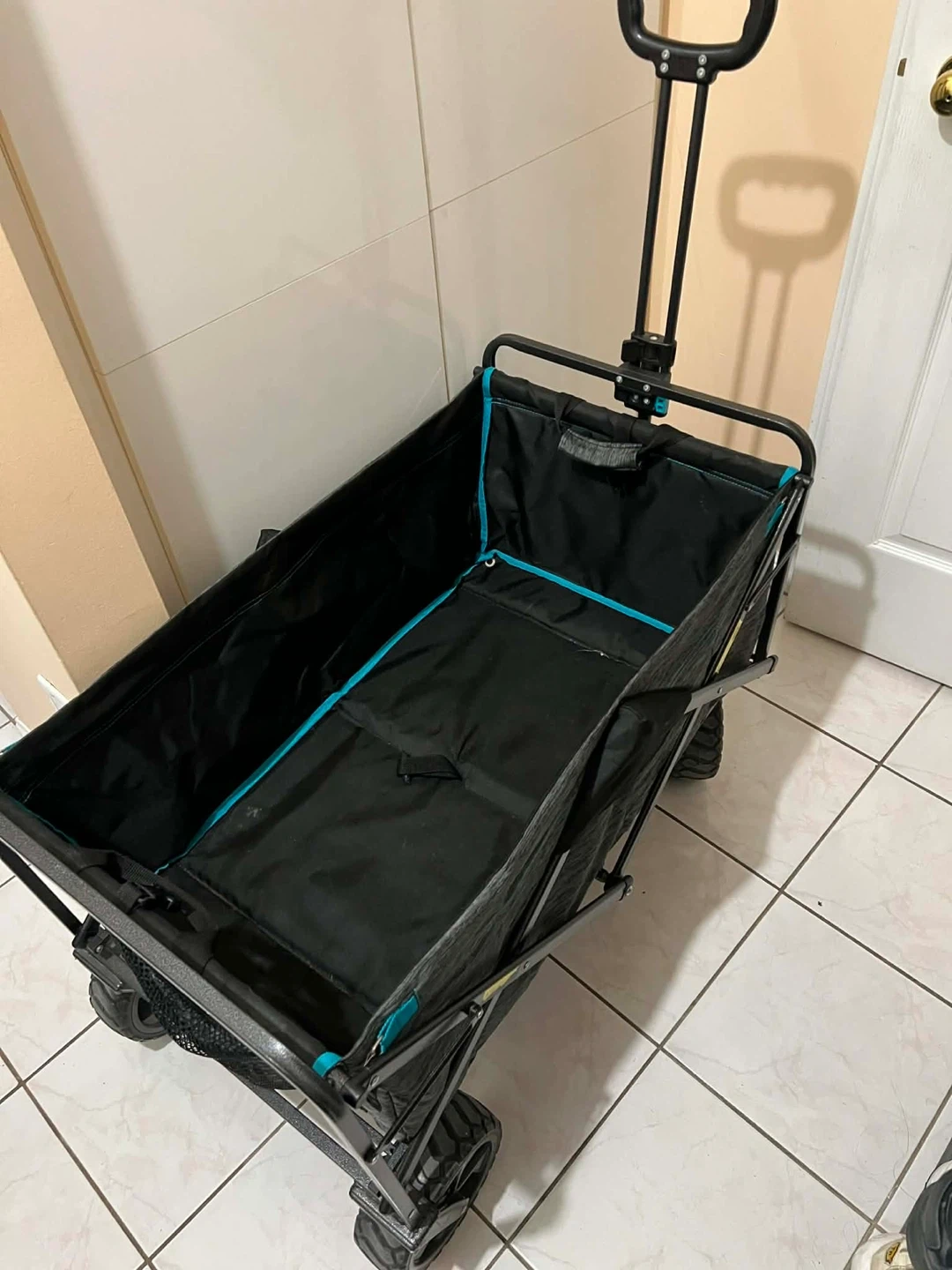 This black folding wagon is great for hauling gear. It's made with durable fabric and features sturdy wheels. Easy to set up and store!