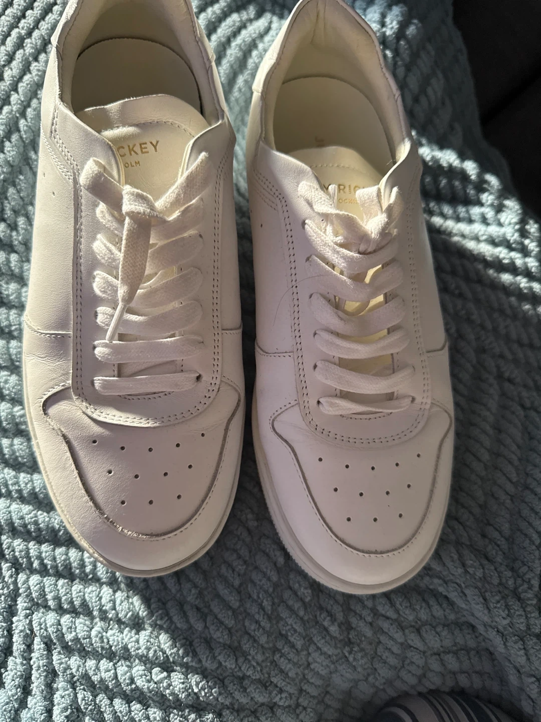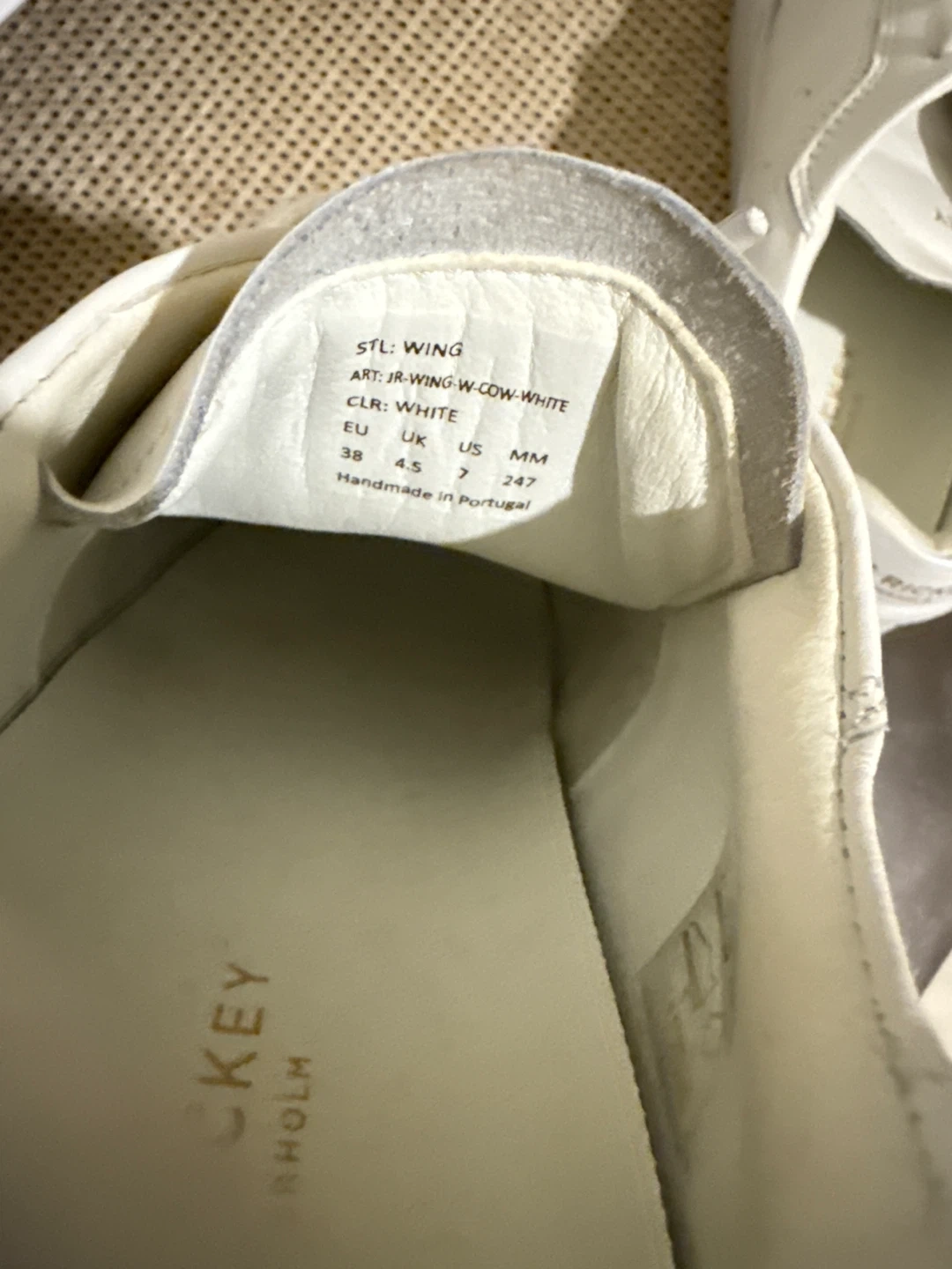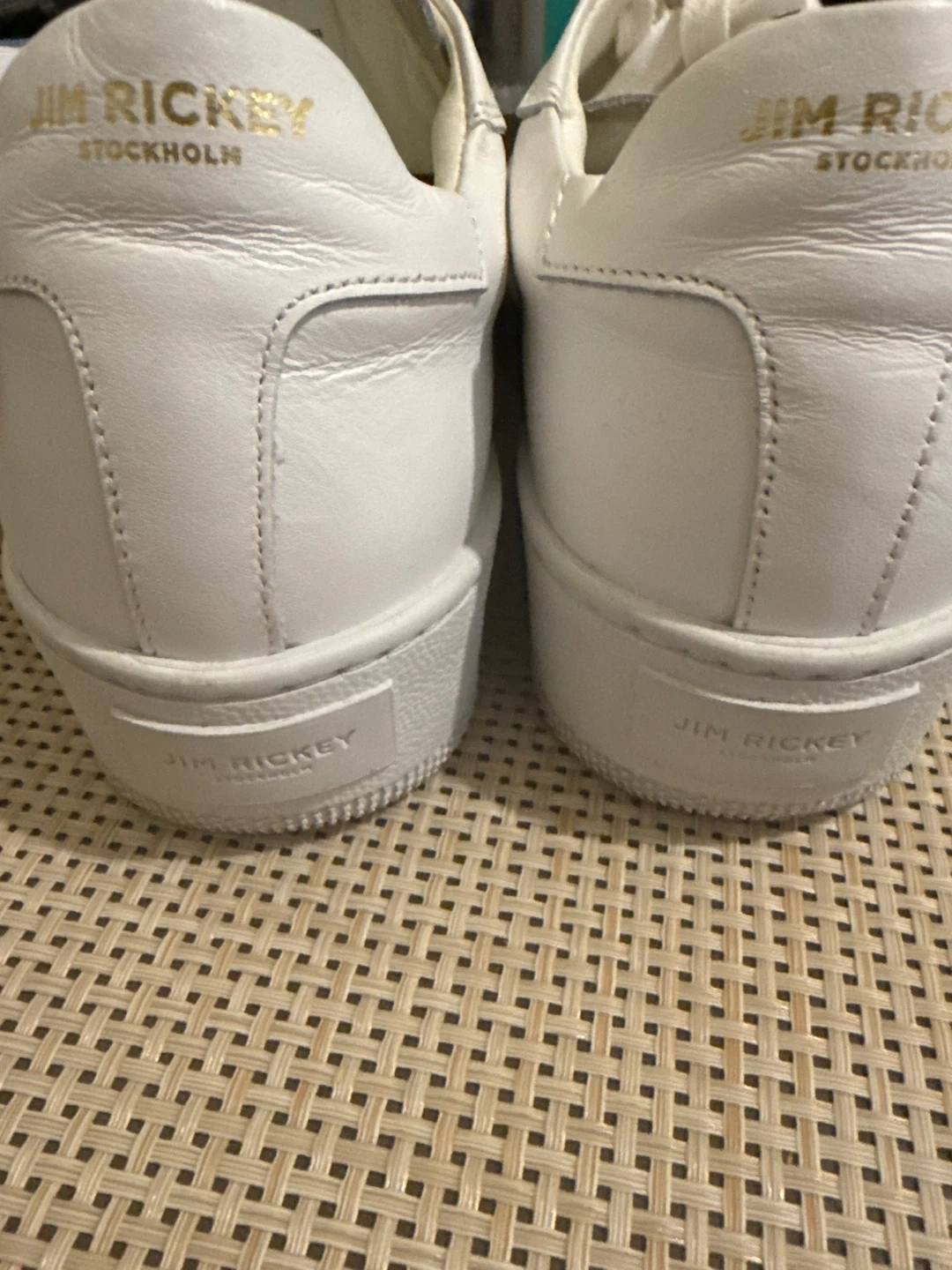 White leather sneakers from Jim Rickey Stockholm. Model STL: WING, ART: JR-WING-W-COW-WHITE. These shoes are handmade in Portugal. Size is US 7, EU 38.