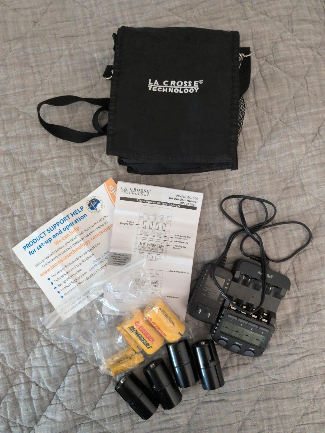 This is a La Crosse Technology BC1000 Alpha Power Battery Charger. It includes the charger, power adapter, carrying case, and several rechargeable AA and AAA batteries. The charger displays current battery levels and modes.