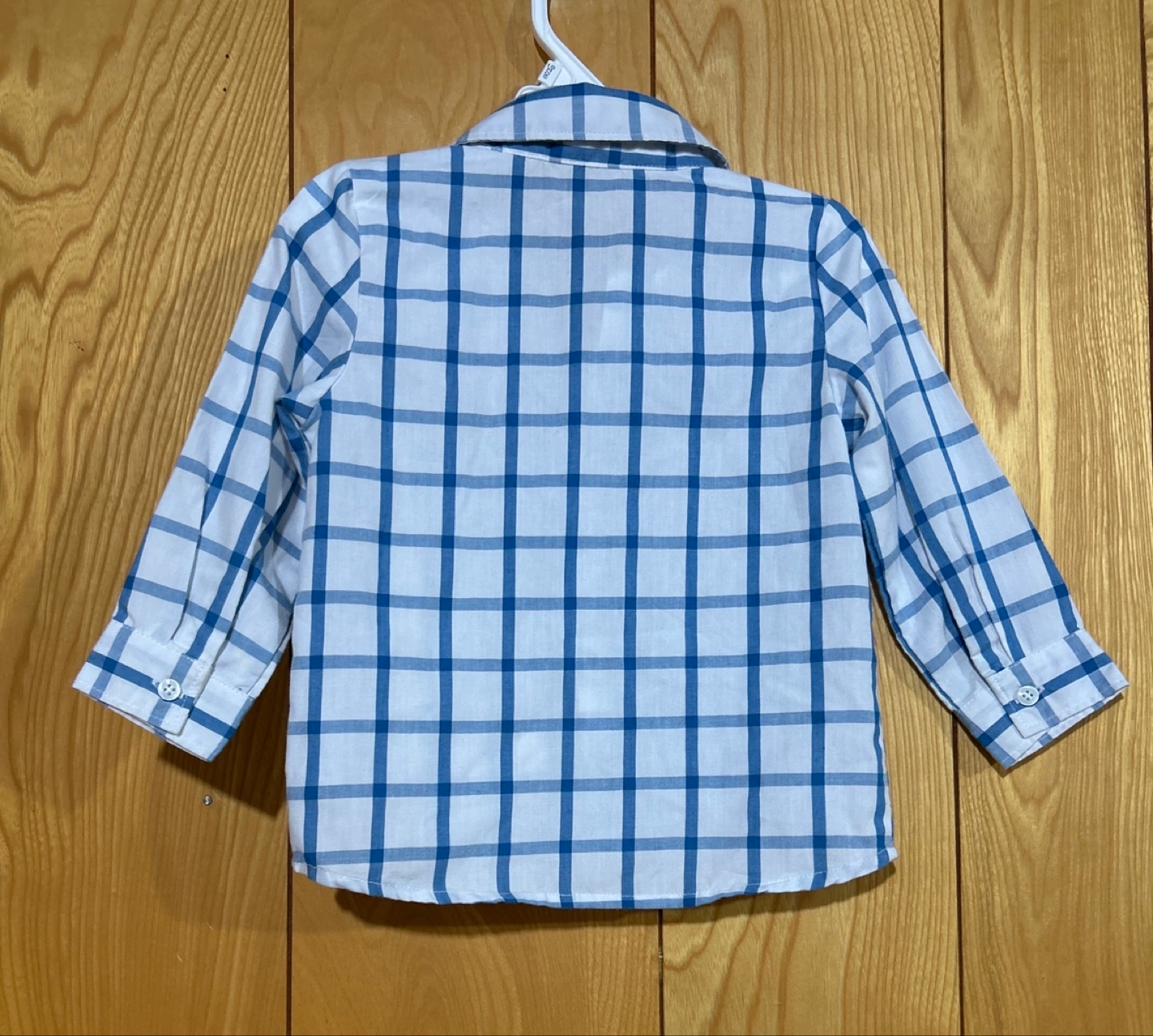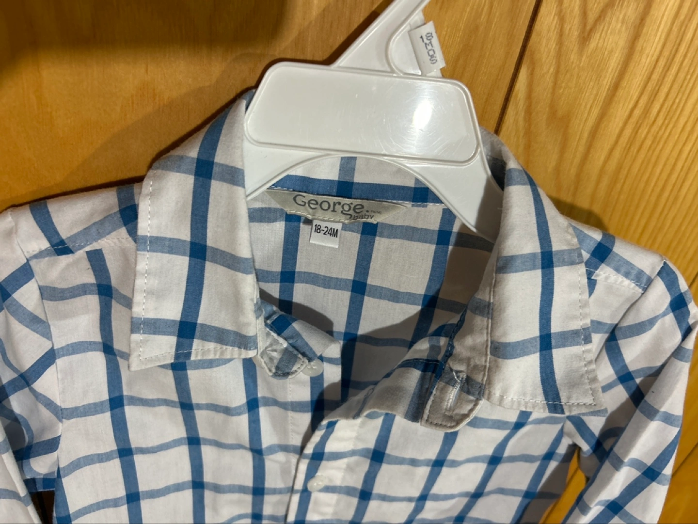 Here's a cute George Baby long-sleeved shirt in size 18-24M! It features a classic blue and white plaid pattern, perfect for your little one. Never worn.