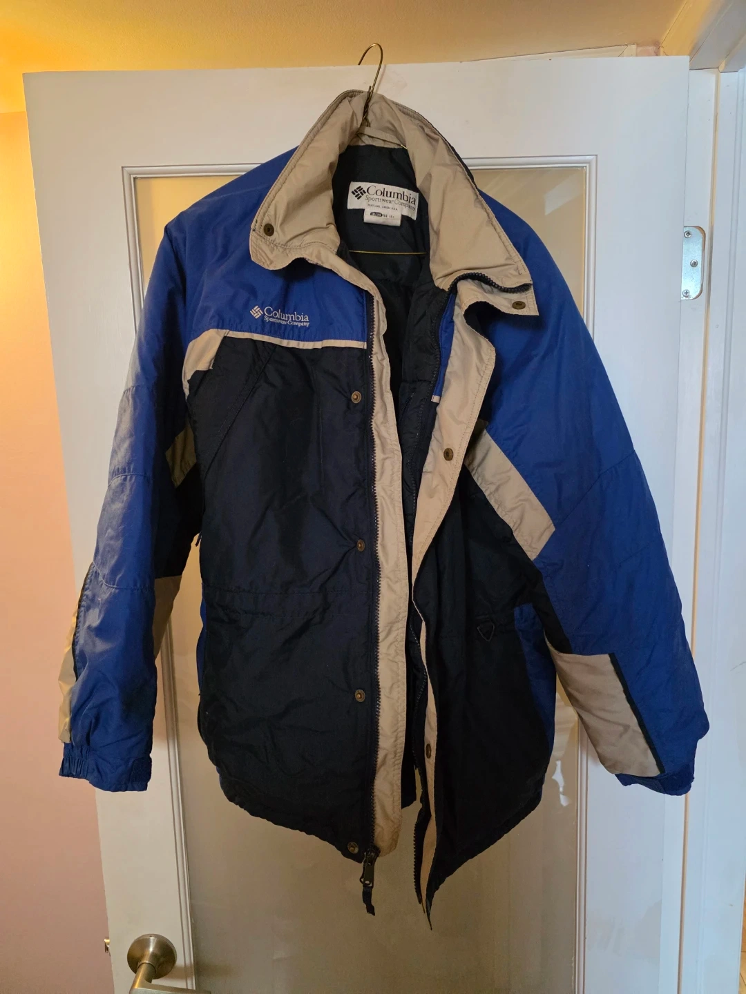 Columbia Fire Ridge jacket in size 18/20. It's a stylish and functional jacket. There is a small barely noticeable stain on the sleeve. Kids size 18 - 20 but fits adult size medium to large. Vintage colors n style .