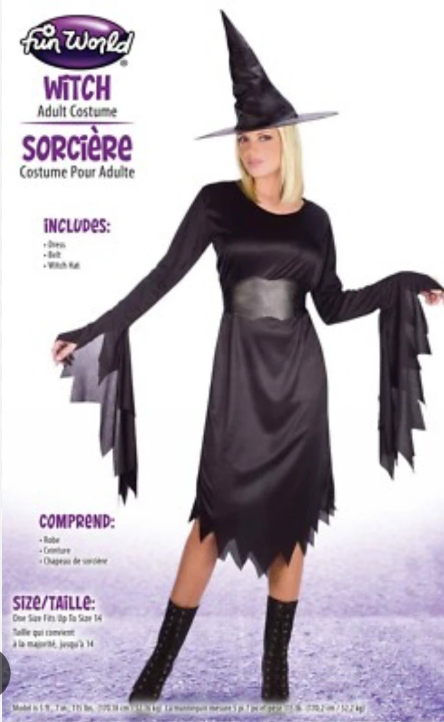Selling a Fun World Witch adult costume! It includes the dress, belt, and witch hat. The size fits up to size 14. Perfect for Halloween or costume parties!
