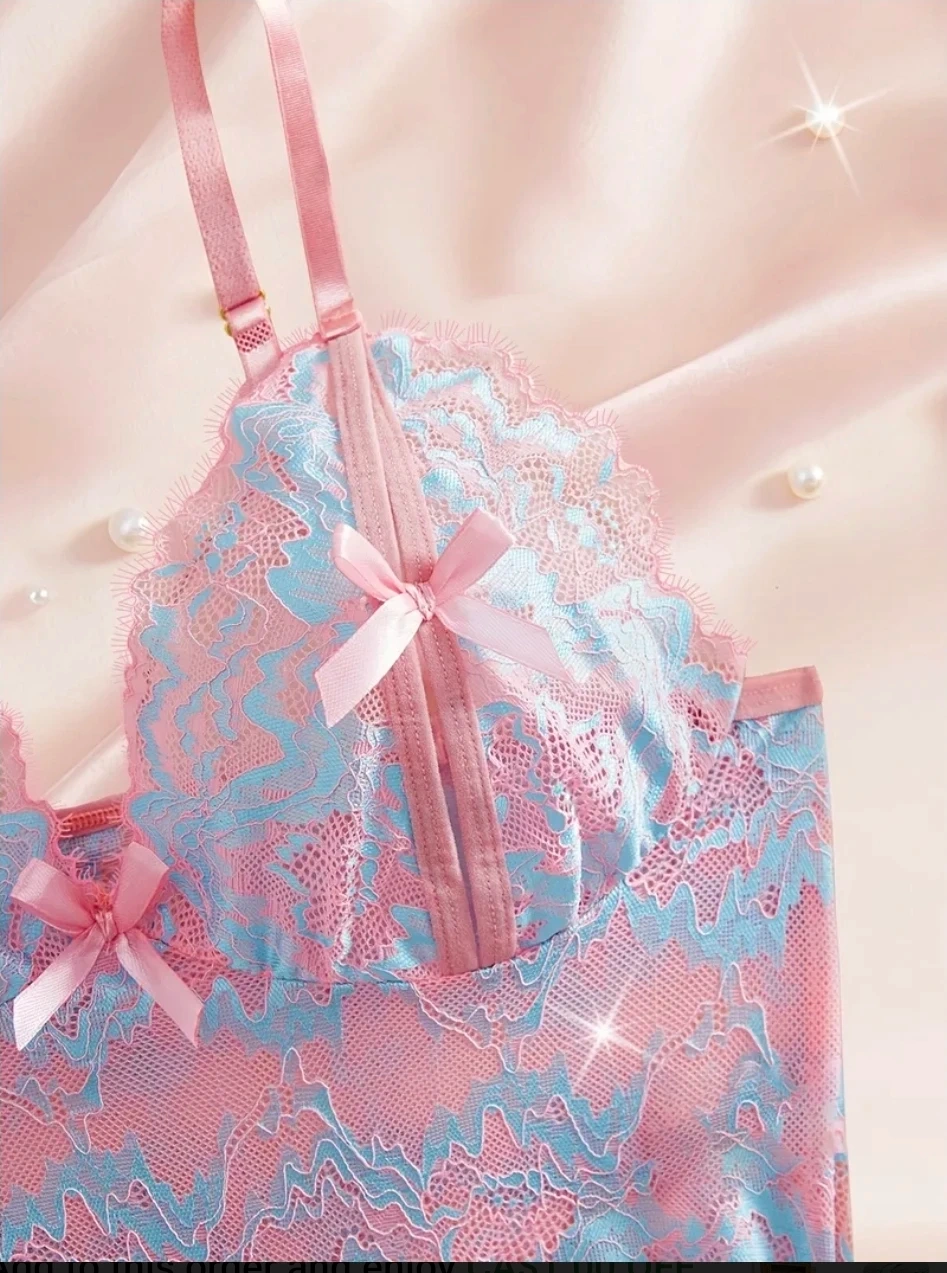 A pretty pink and blue lace bralette and matching shorts set. Includes adjustable straps and bow details. This set is a size medium.