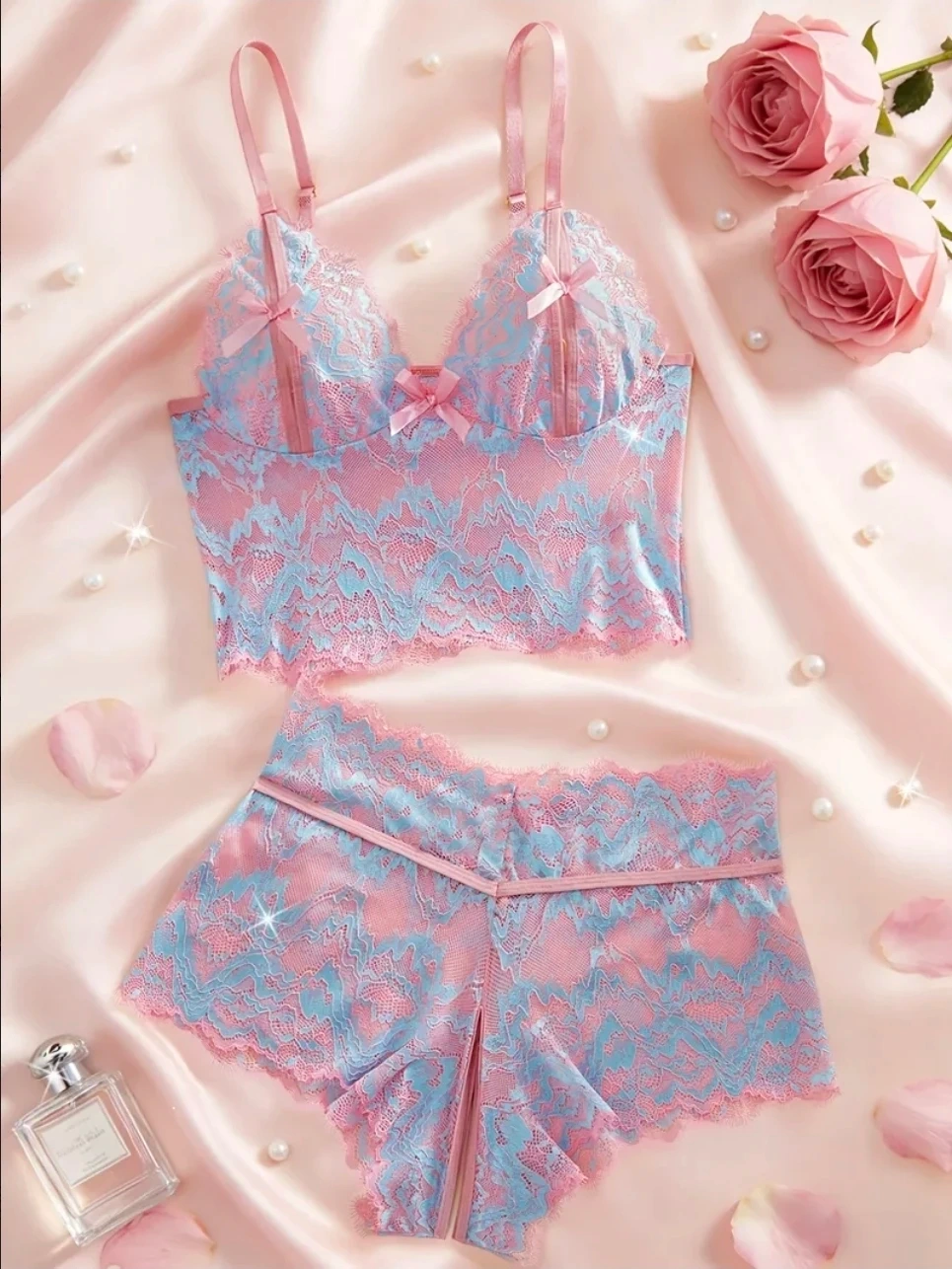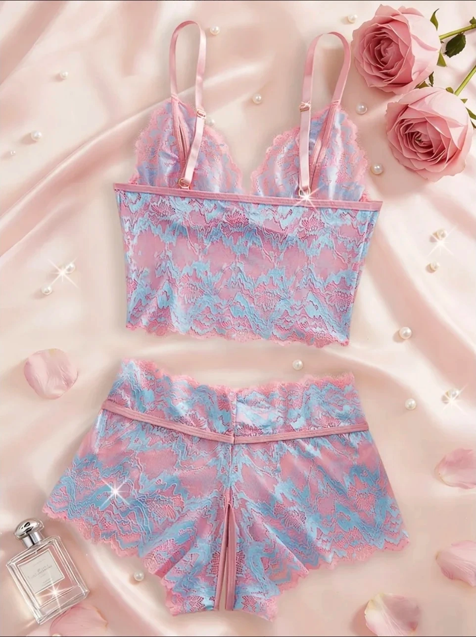 Lace Bralette and Shorts Set - Pink/Blue - Medium π