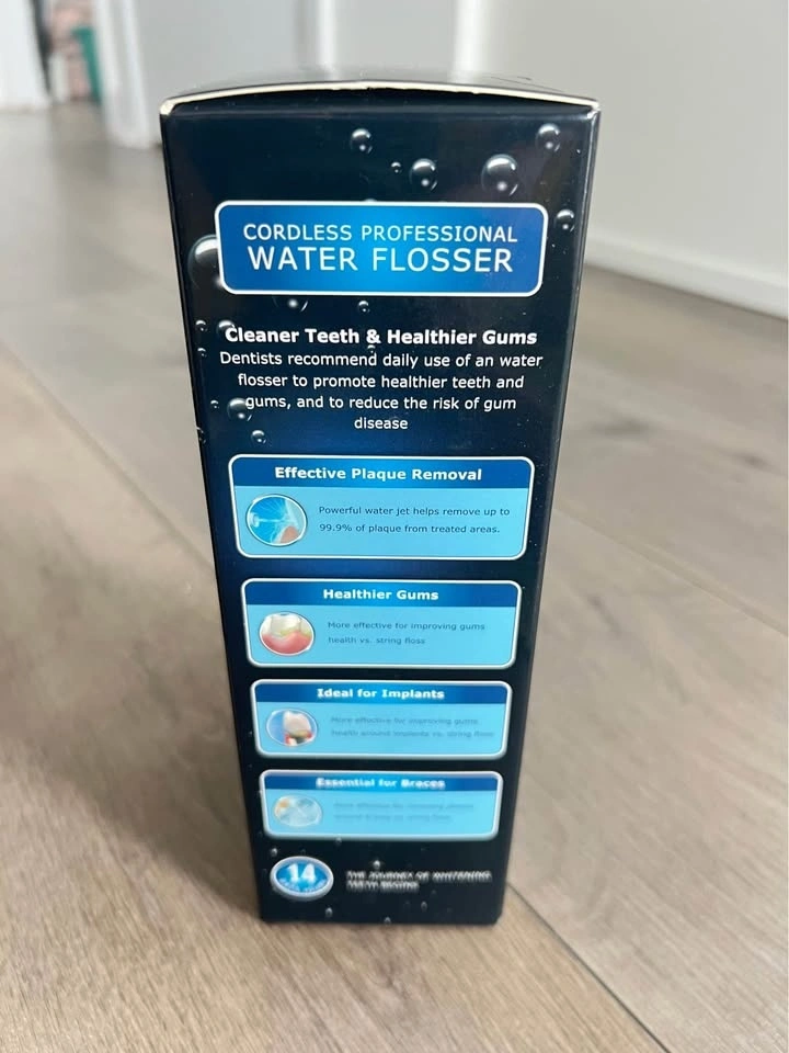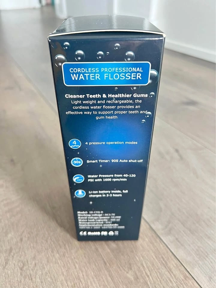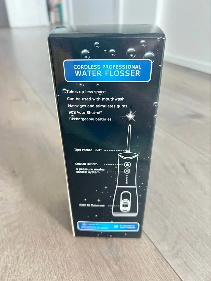 Cordless water flosser for cleaner teeth and healthier gums. This professional water flosser is lightweight and rechargeable. Has 4 pressure modes and a smart 90-second auto shut-off timer. Water pressure from 40-120 PSI. Li-ion battery, charges in 2-3 hours. Great for plaque removal, healthier gums, and perfect if you have implants or braces. Takes up less space and you can even use it with mouthwash. Tips rotate 360 degrees, easy fill reservoir.