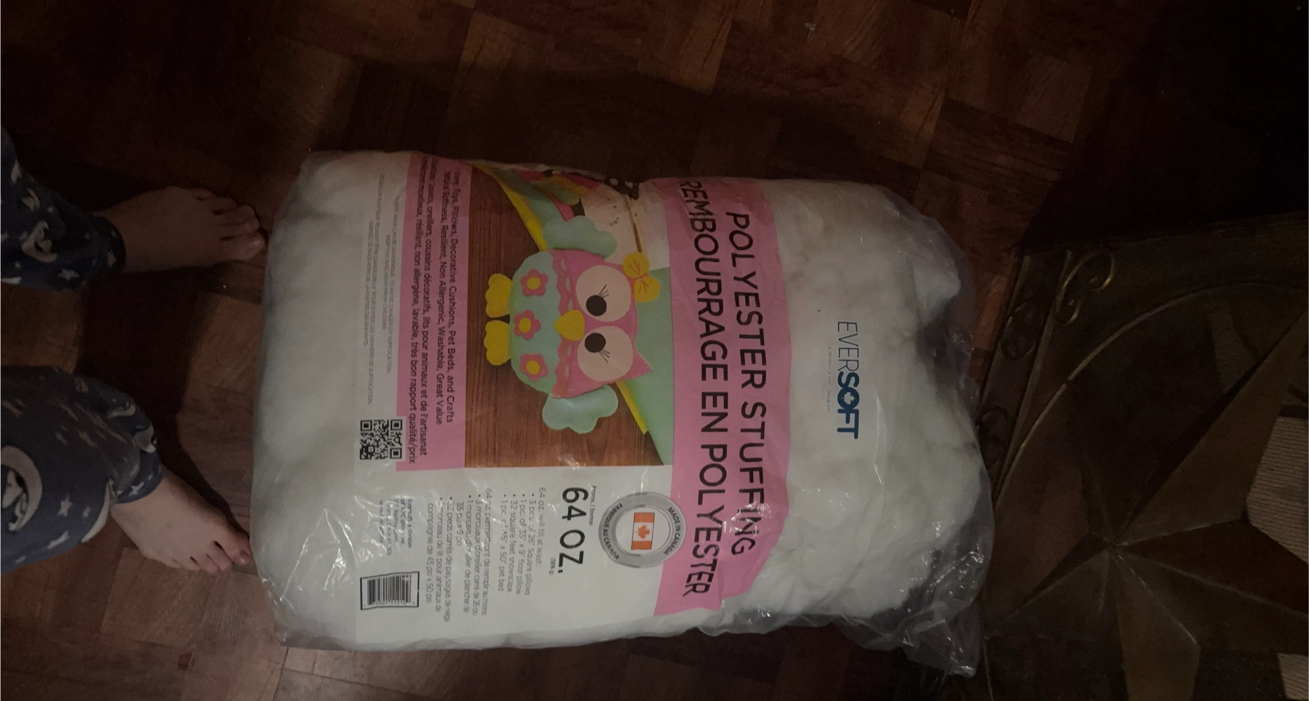 I'm selling a bag of Eversoft polyester stuffing! It's perfect for toys, pillows, decorative cushions, pet beds, and crafts. It's also non-allergenic, washable, and has great value. The 64 oz bag will fill at least 3 pieces of 26" square pillows or one 35" x 9" floor pillow