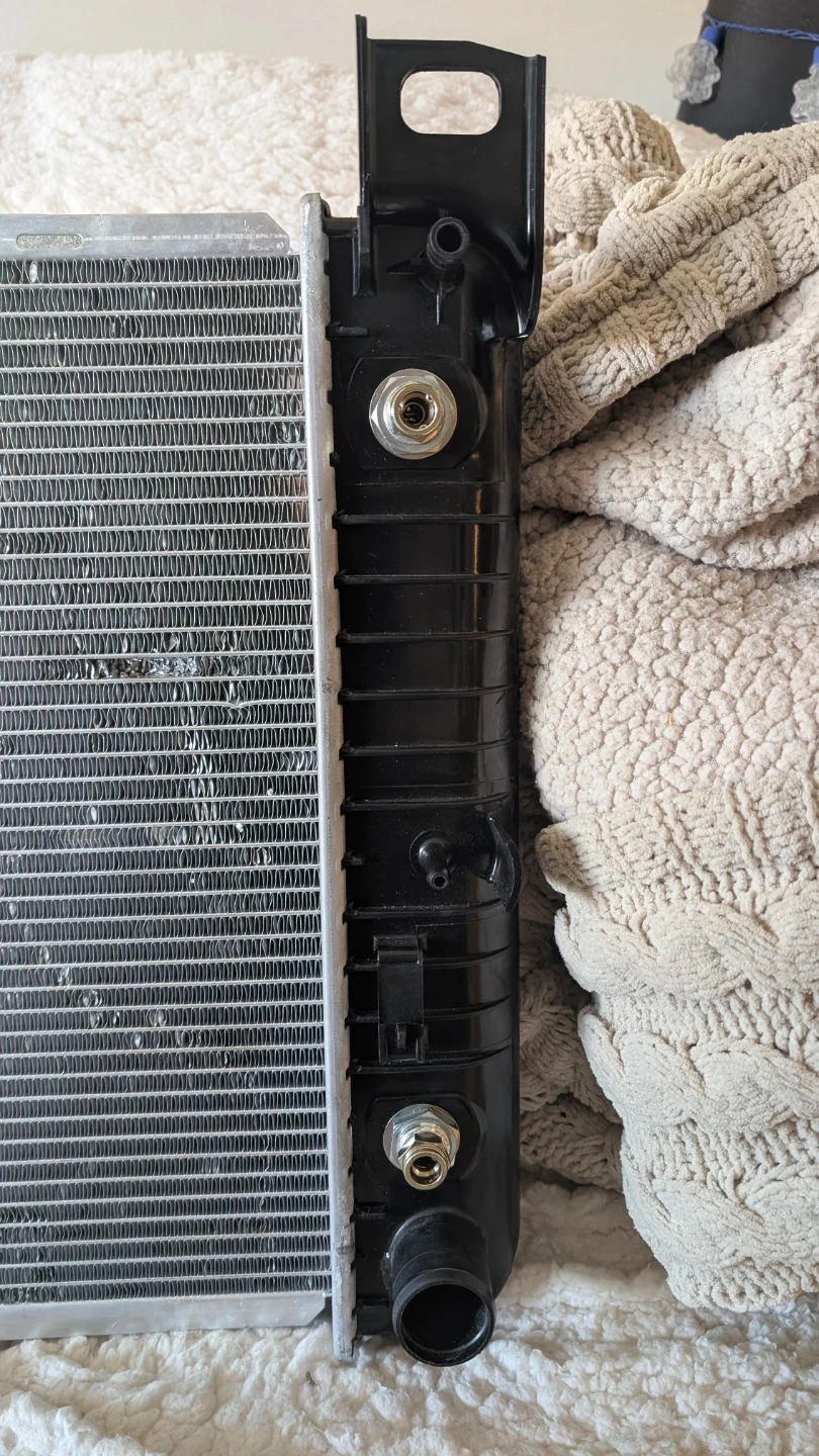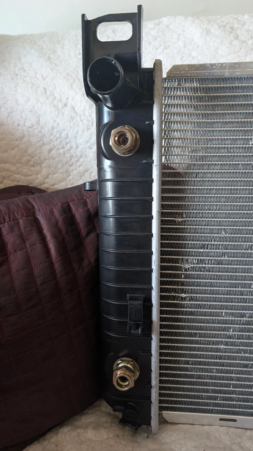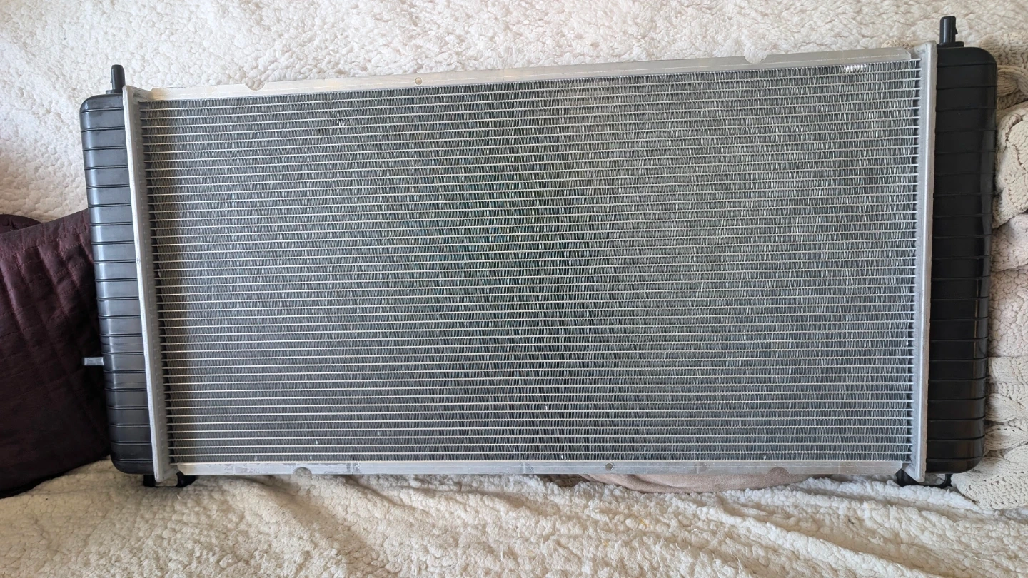 This unit is 40 and 1/2 inches from end to. The wrong one was sent to me check your vehicle for dimensions for correct fit. Also checked radiator hoses and how many come out of which side.
