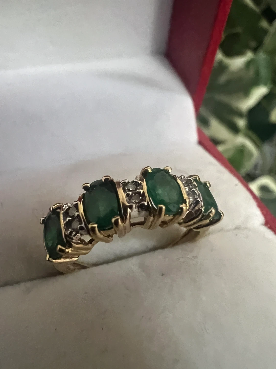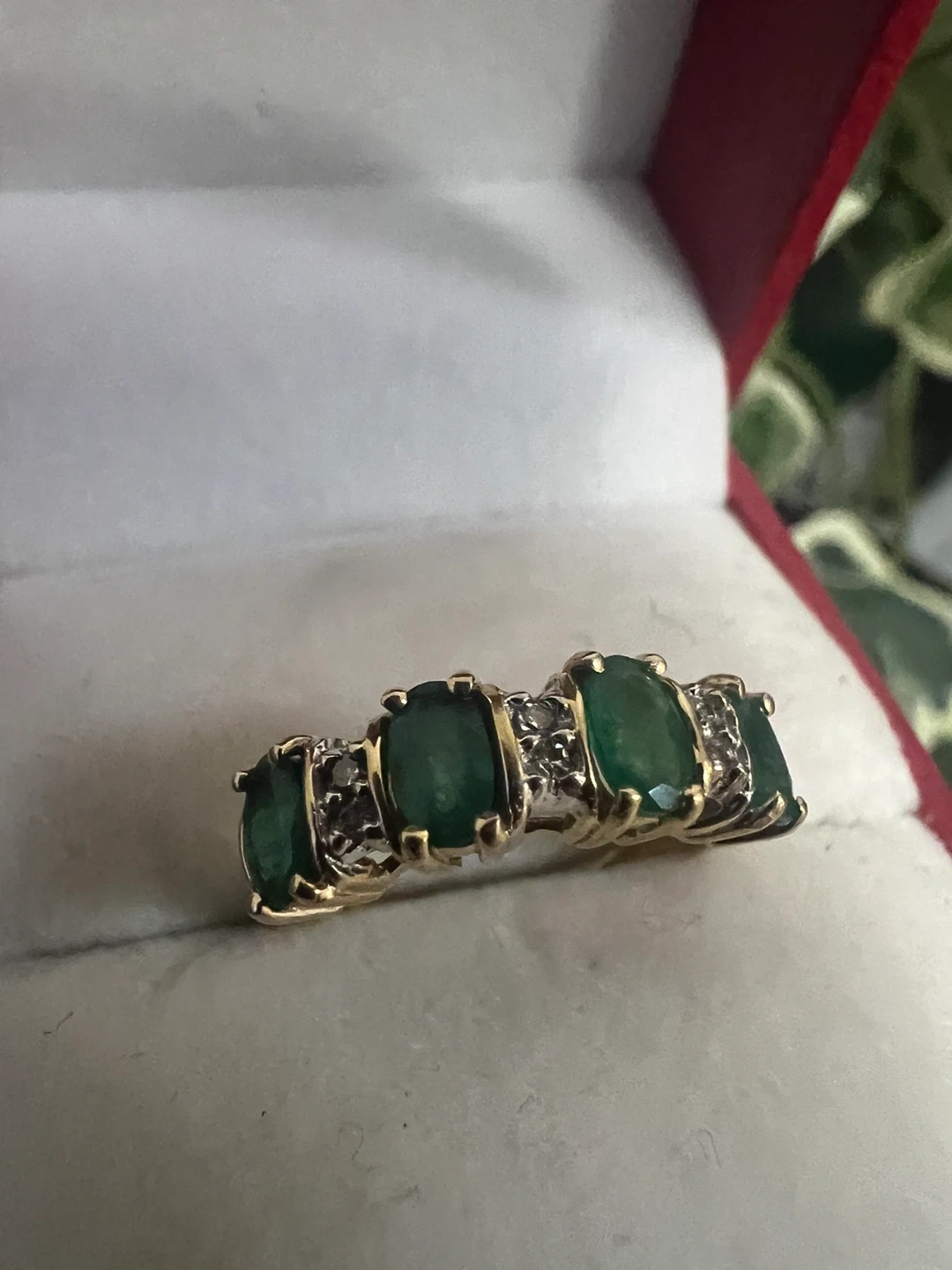 A beautiful 14k gold ring featuring five oval emeralds interspersed with small diamonds. This ring's classic design makes it a lovely addition to any jewelry collection. It's perfect for anniversaries or special occasions!