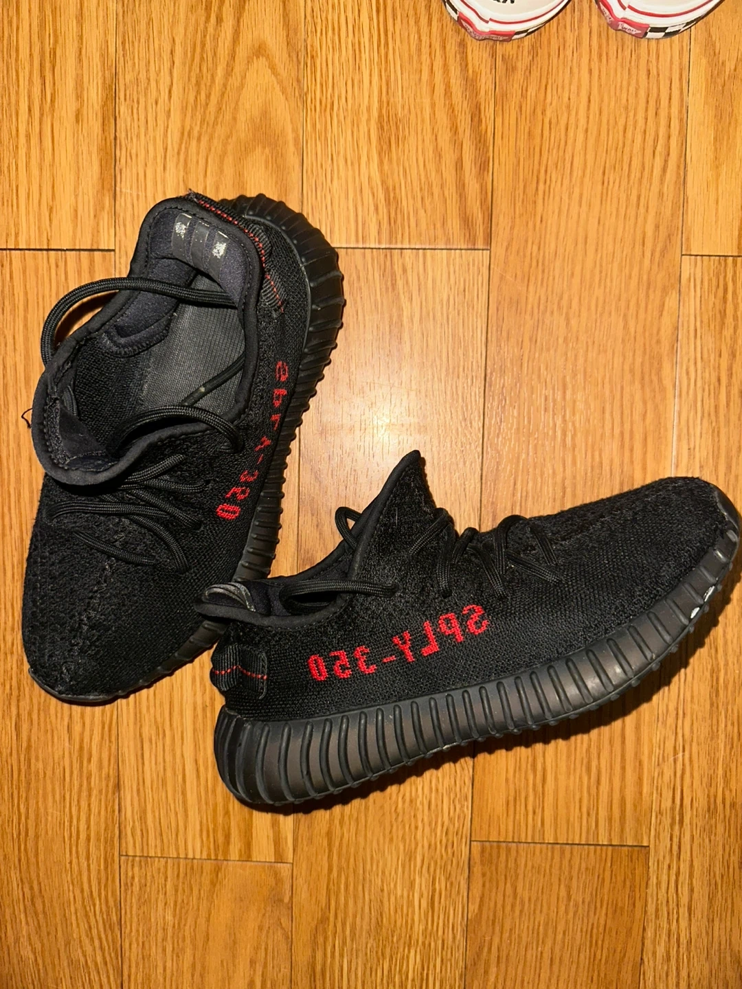 These Adidas Yeezy Boost 350 V2 sneakers are in the "Bred" colorway. They feature a black Primeknit upper with red "SPLY-350" text and a translucent black midsole. These are a popular streetwear staple!
