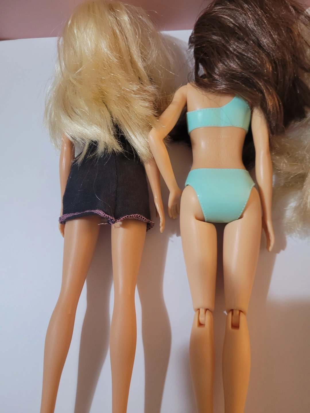 Three Barbie dolls. Two blonde dolls, one brunette doll. One wears a black and white dress, one a teal bikini, and one a purple athletic outfit. Posable dolls. Pre-owned.