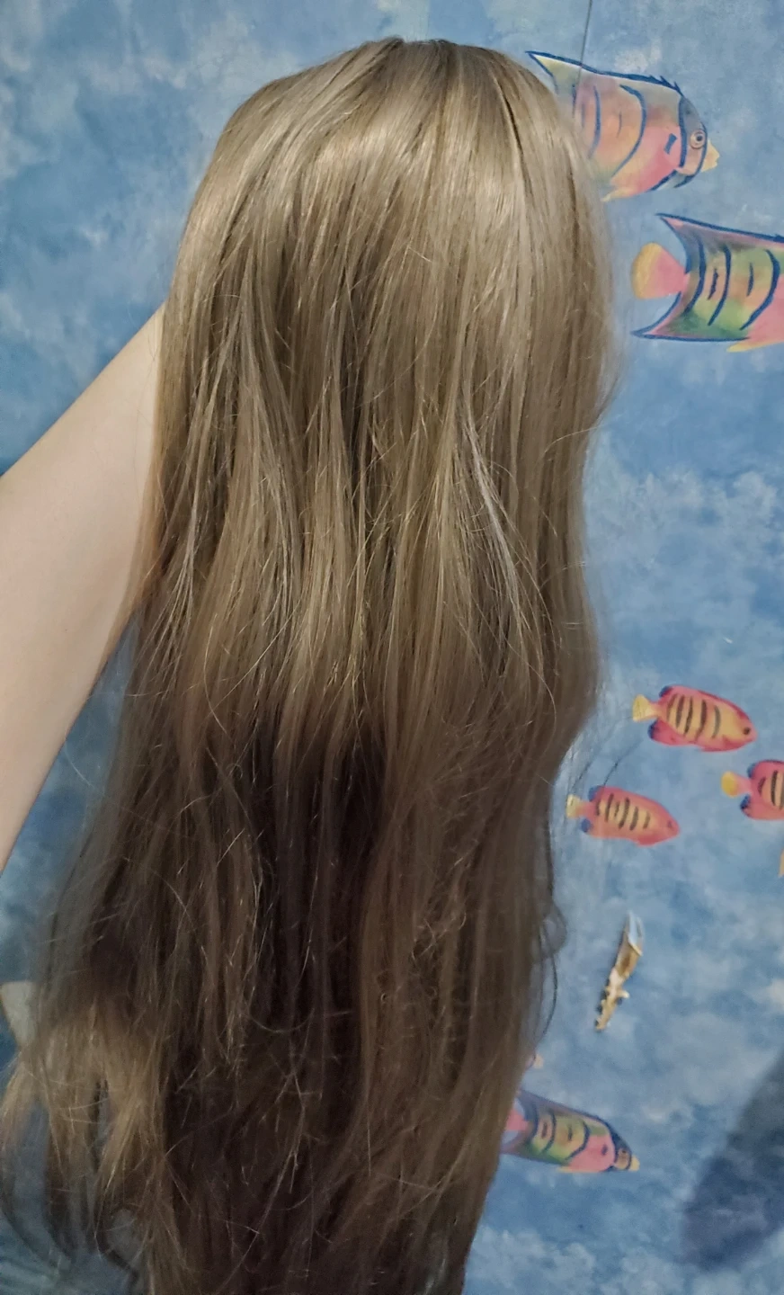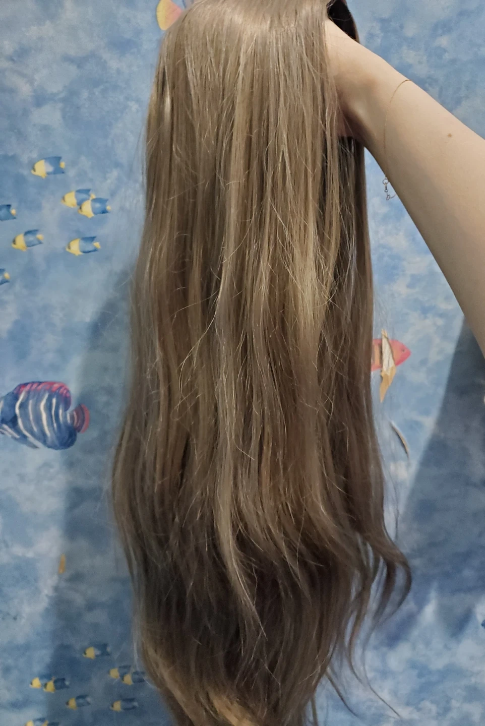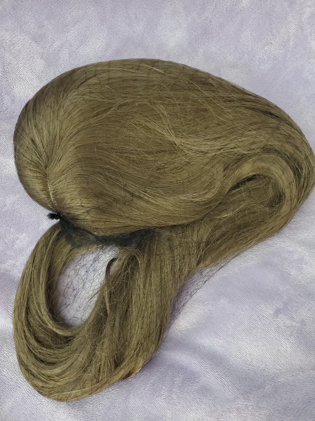 Long light ash brown synthetic fringeless wig. Has a mix of light brown and light grey strands. Wig is slightly wavy towards the ends. Length is approx 73 cm (while wavy), if straightened, would estimate close to 80 cm. Have not tried to heat style so can't comment on if the wig is heat style friendly. Comes with hair net and wig cap. The wig base has clasps to secure the wig to the wig cap. Good condition, but some of the hairs near the ends feel slightly coarser/less smooth than the hair near the base.
