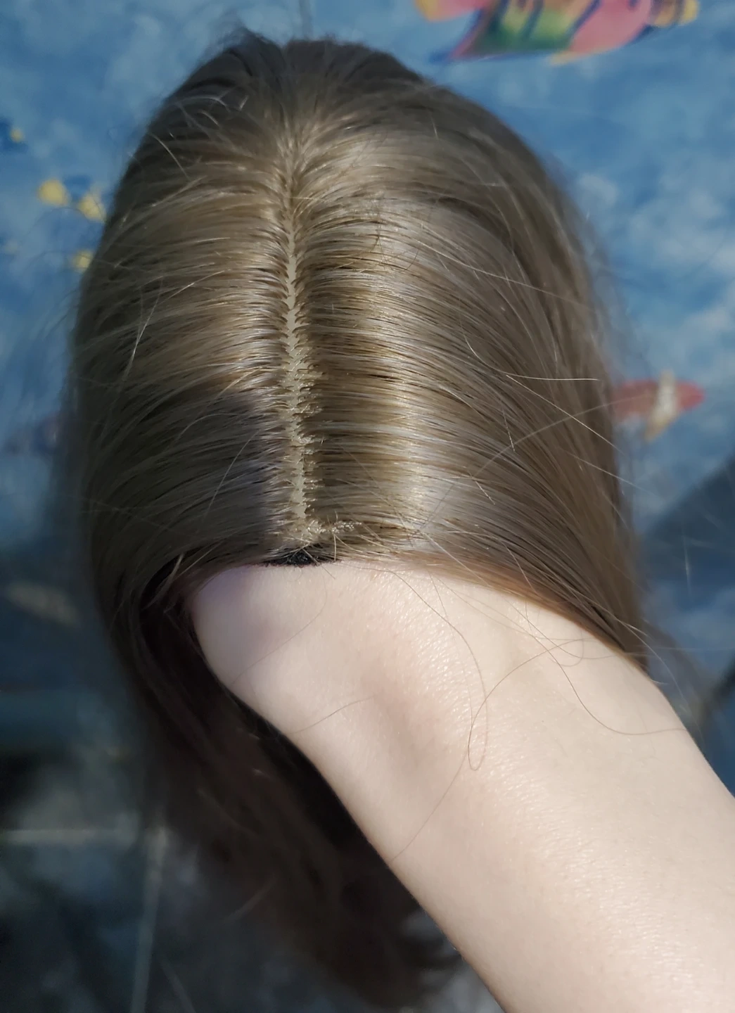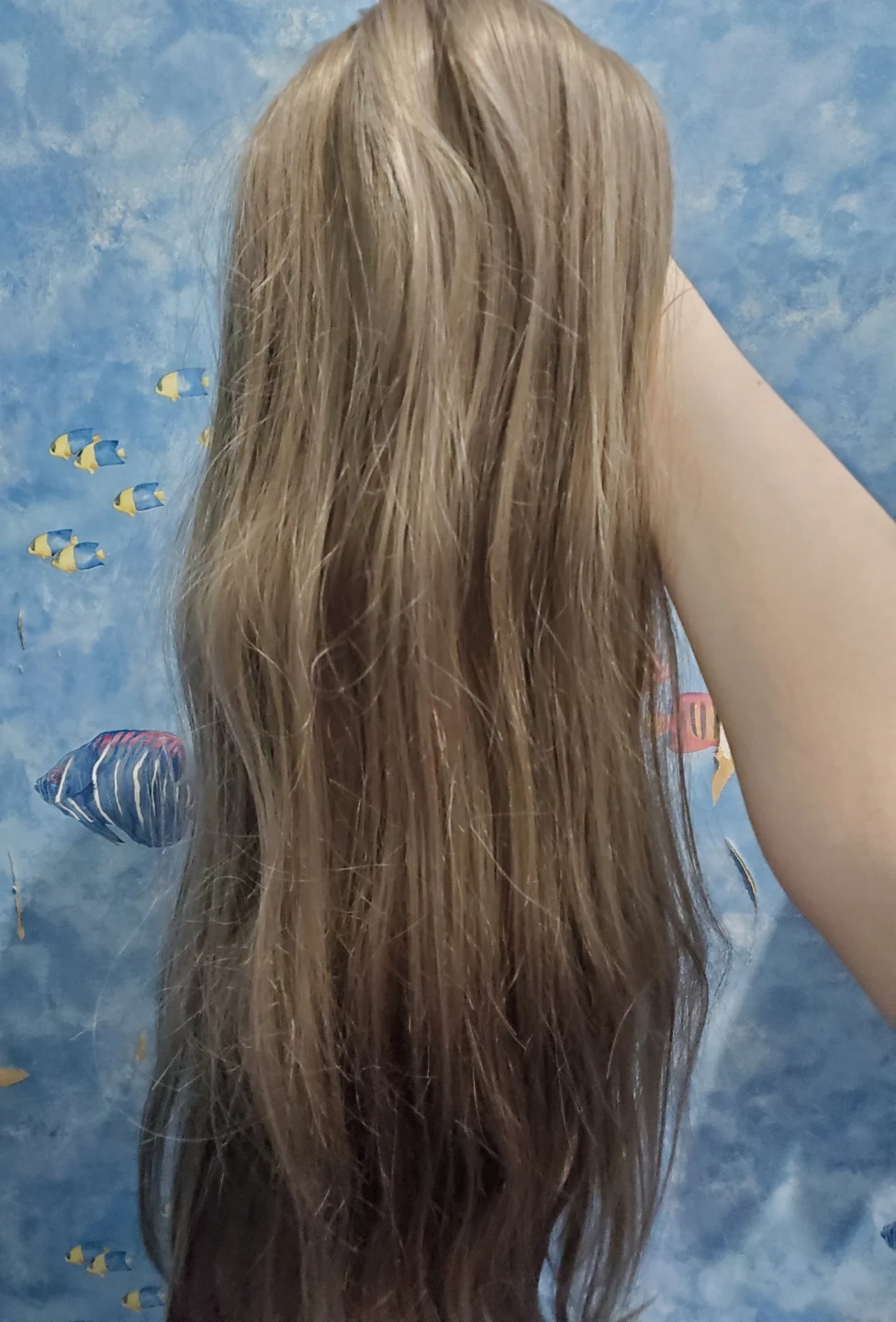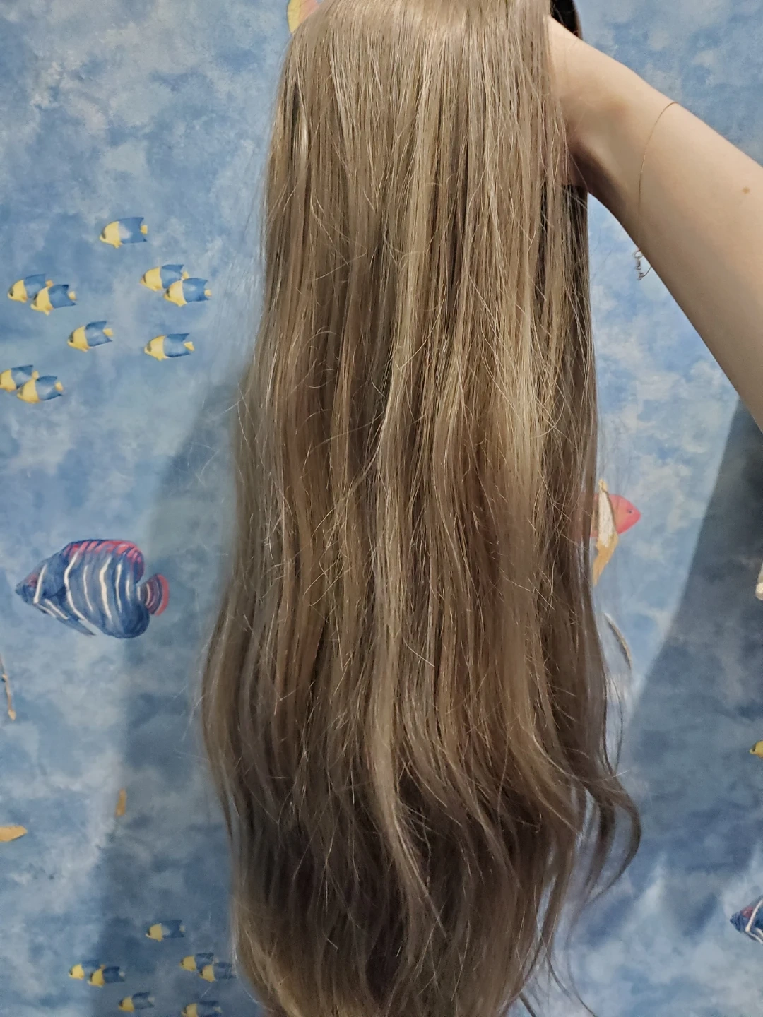 Long light ash brown synthetic fringeless wig. Has a mix of light brown and light grey strands. Wig is slightly wavy towards the ends. Length is approx 73 cm (while wavy), if straightened, would estimate close to 80 cm. Have not tried to heat style so can't comment on if the wig is heat style friendly. Comes with hair net and wig cap. The wig base has clasps to secure the wig to the wig cap. Good condition, but some of the hairs near the ends feel slightly coarser/less smooth than the hair near the base.
