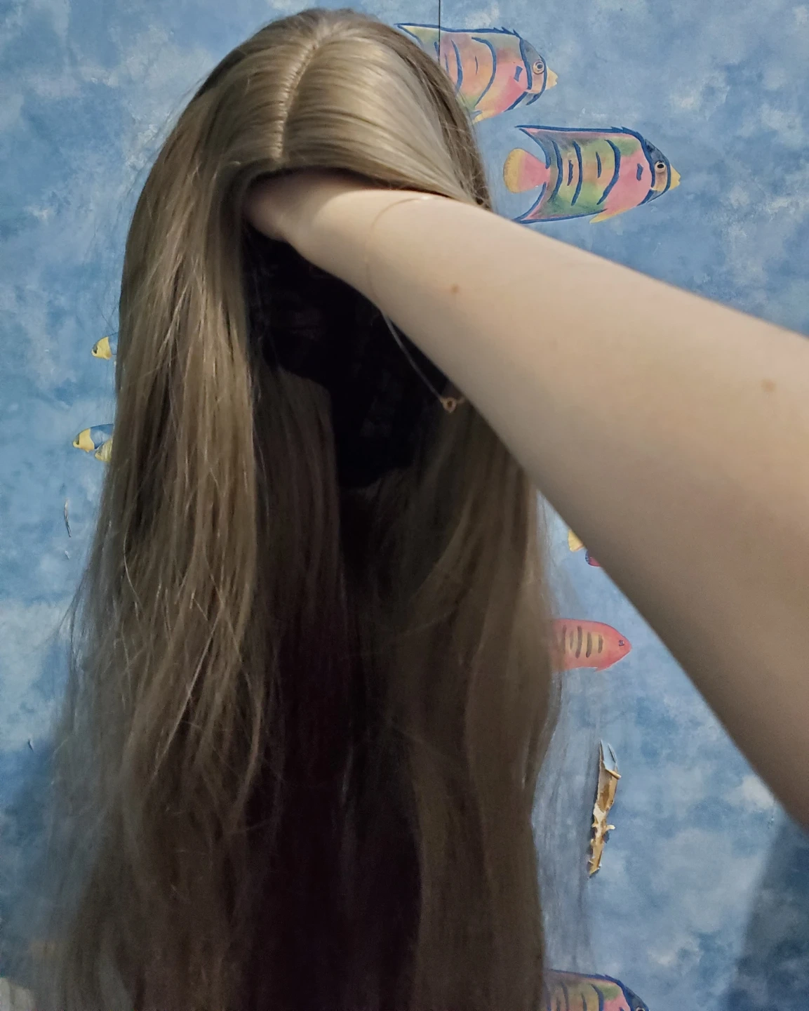 Long light ash brown synthetic wig without fringe