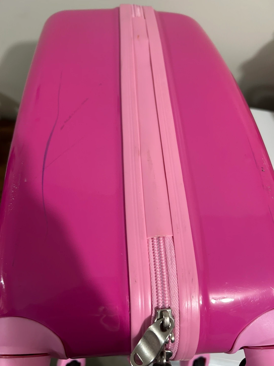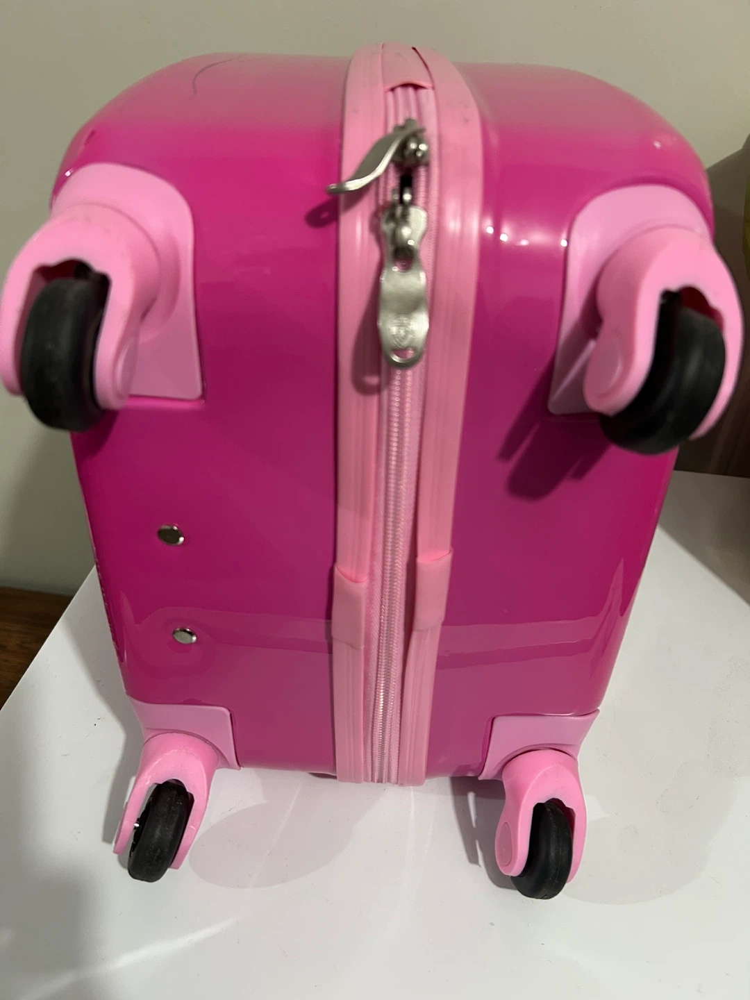 Condition: Pre-owned/Used. It has some visible scuffs and scratches on the exterior (see photos for details), but it’s structurally sound, clean inside, and all zippers/wheels work perfectly.