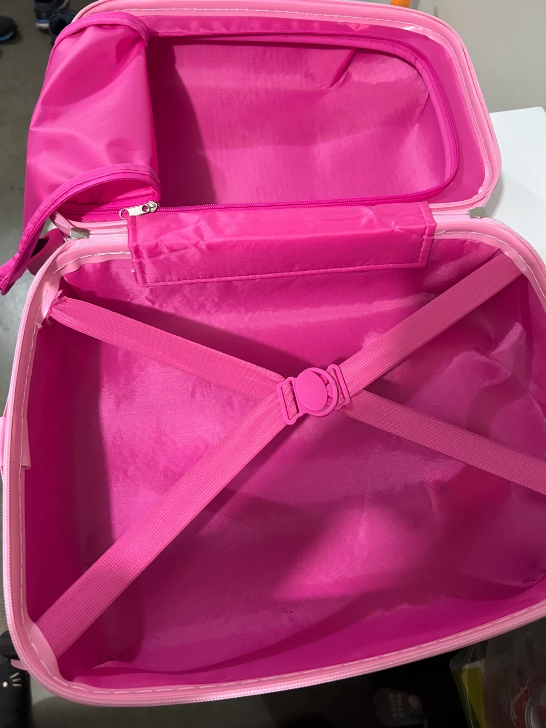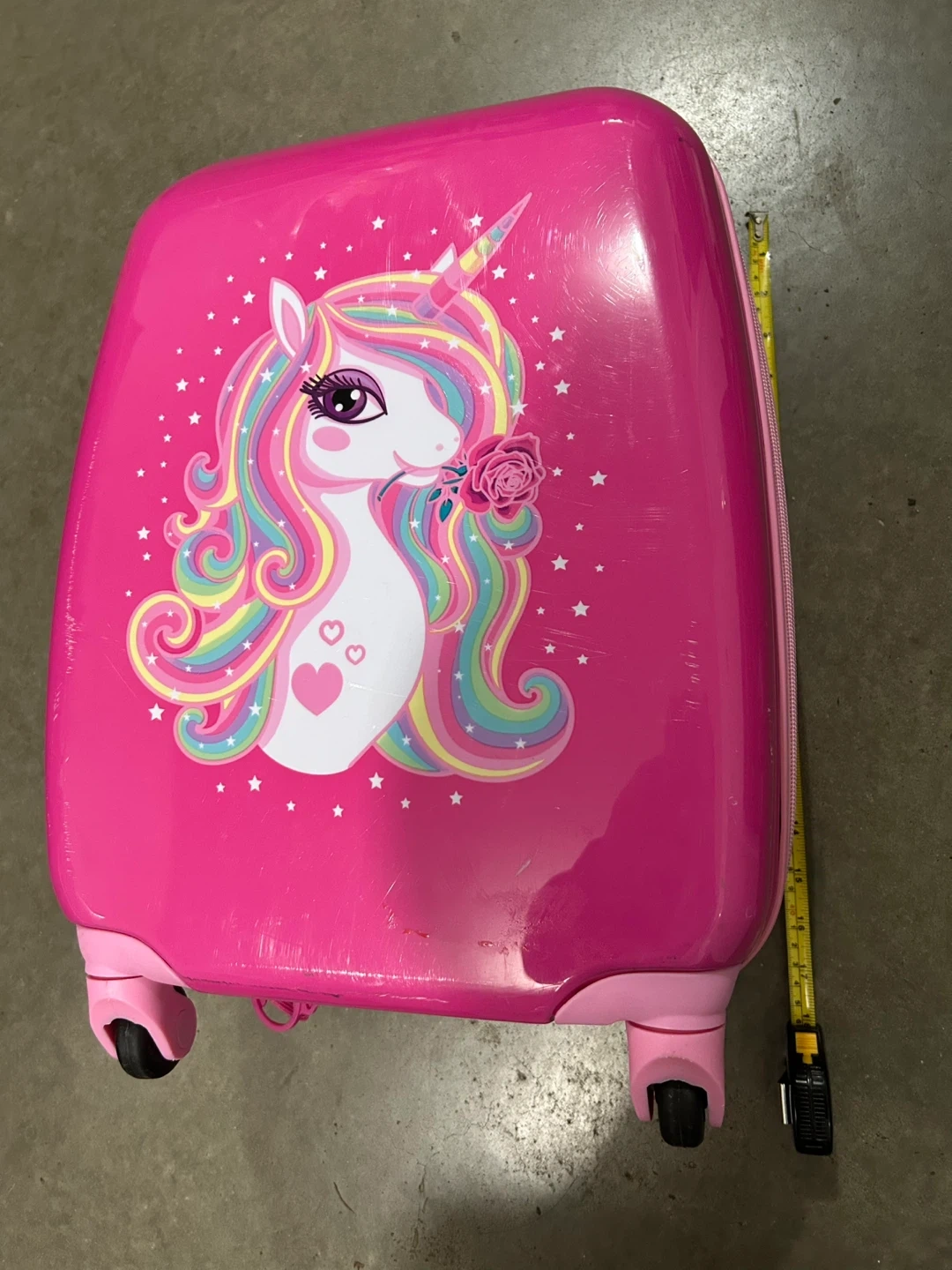 This vibrant pink rolling suitcase features a colourful unicorn design, perfect for young travellers! It's made of durable hard shell material and has interior straps to keep belongings secure. An ideal carry-on for sleepovers or short trips.