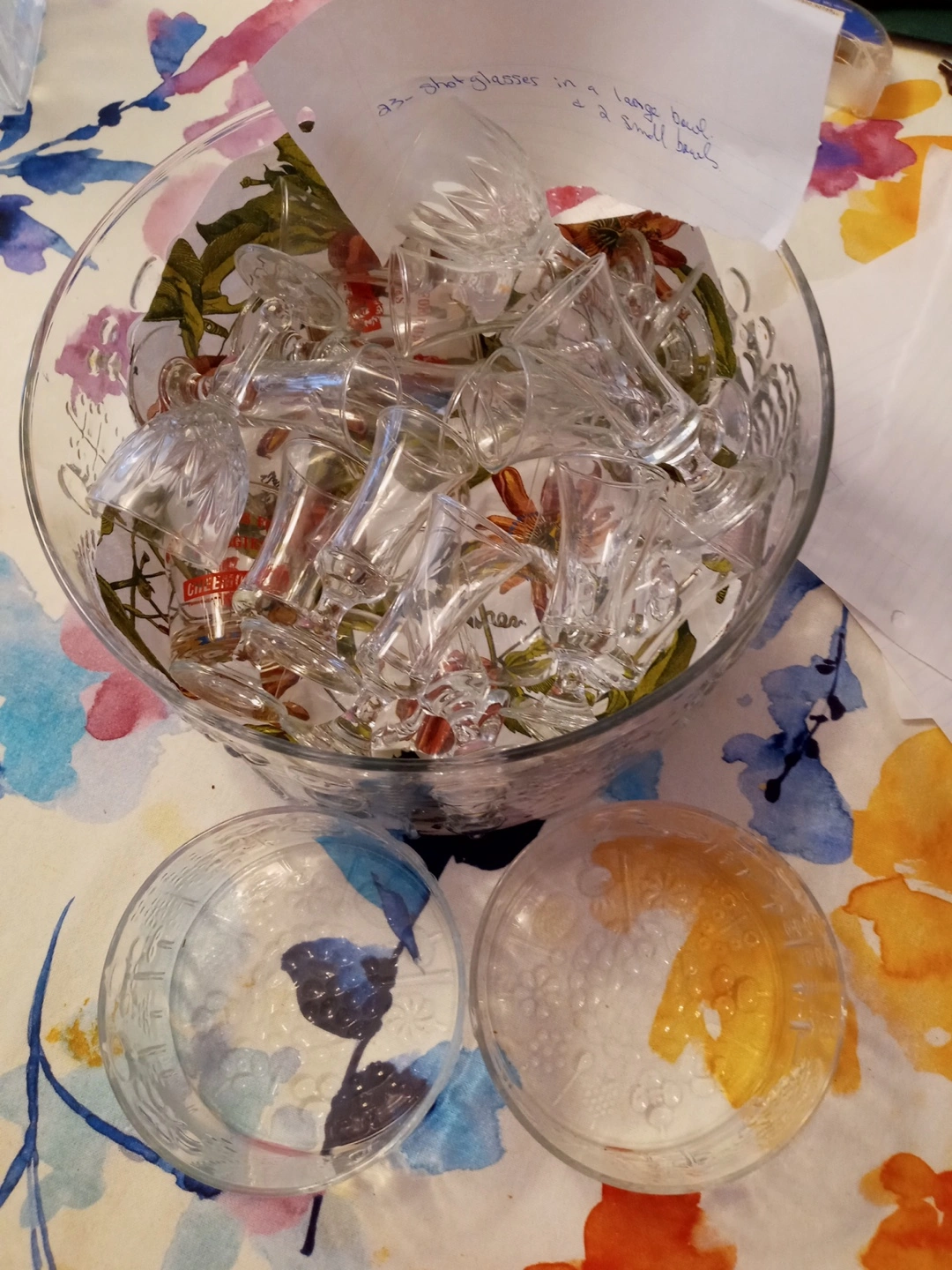 I have a collection of shot glasses and small bowls for sale. There are about 23 shot glasses in a large bowl, plus two small bowls. Perfect for parties or gatherings!