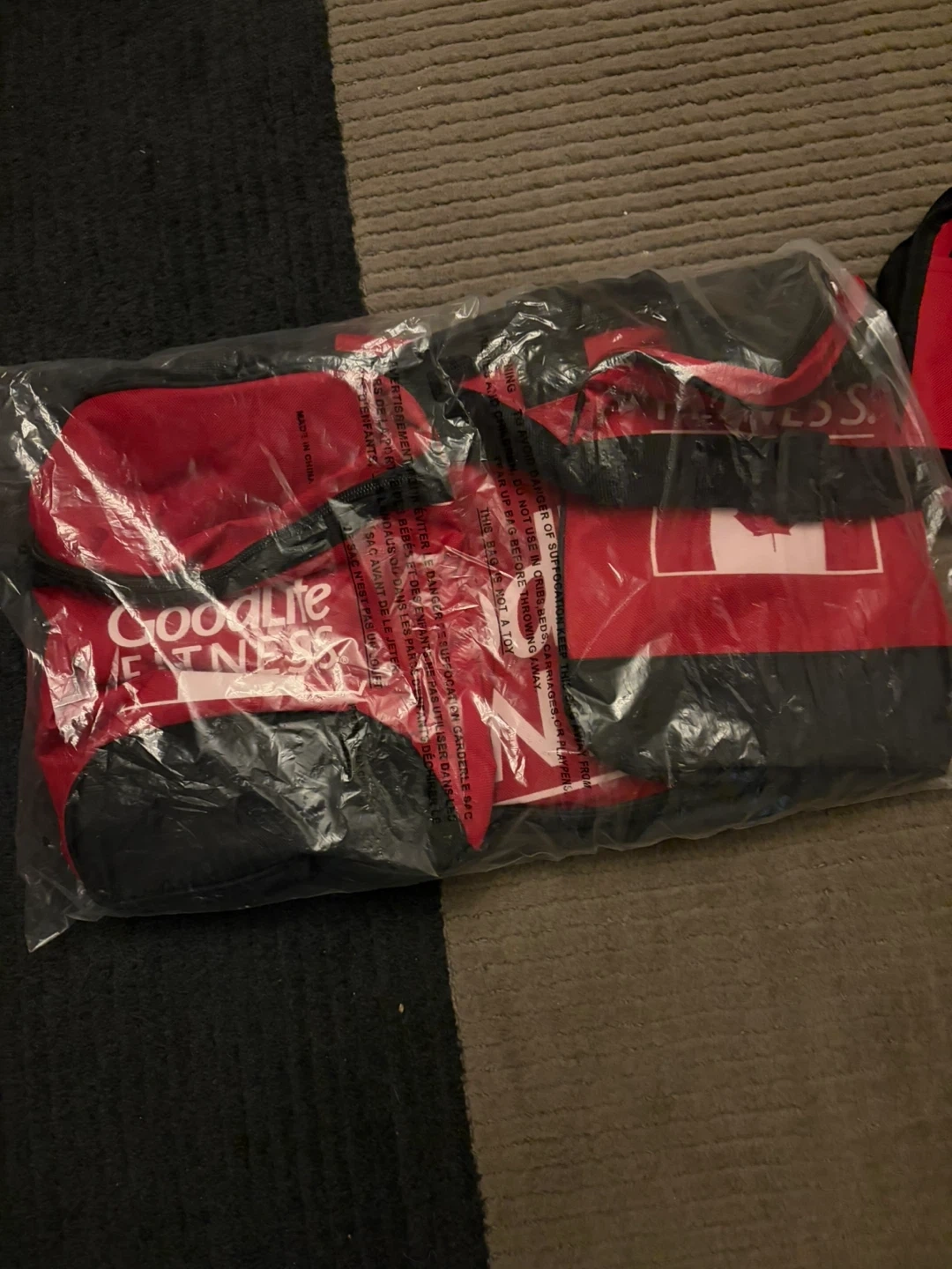 This GoodLife Fitness duffle bag is red and black. It has a Canadian flag design on the side. It's still in its original packaging.