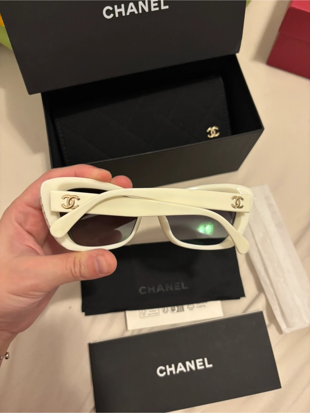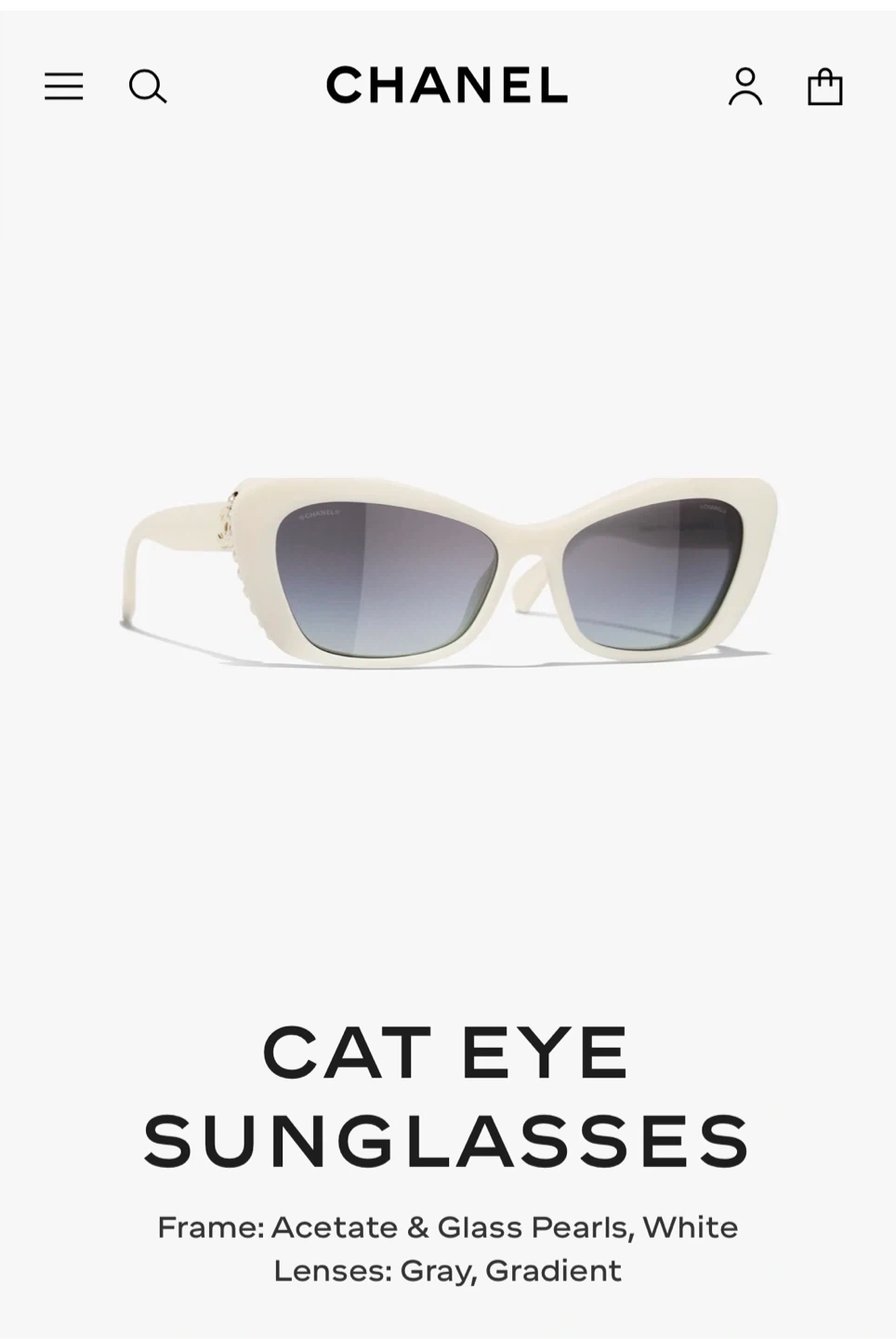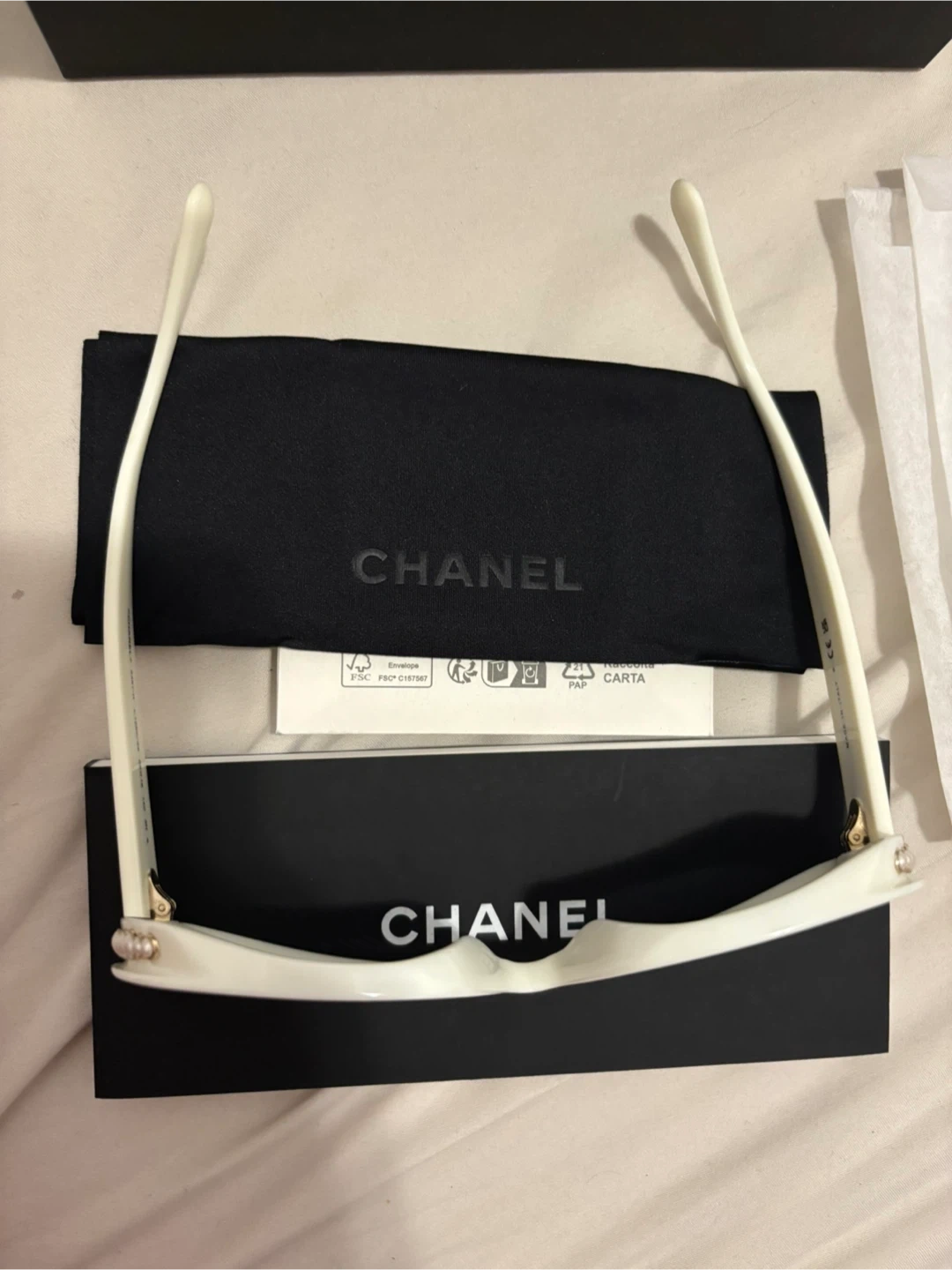 Selling a beautiful pair of Chanel cat eye sunglasses with a white acetate frame and glass pearl detailing! These sunglasses have gray, gradient lenses and come with the original box and packaging
